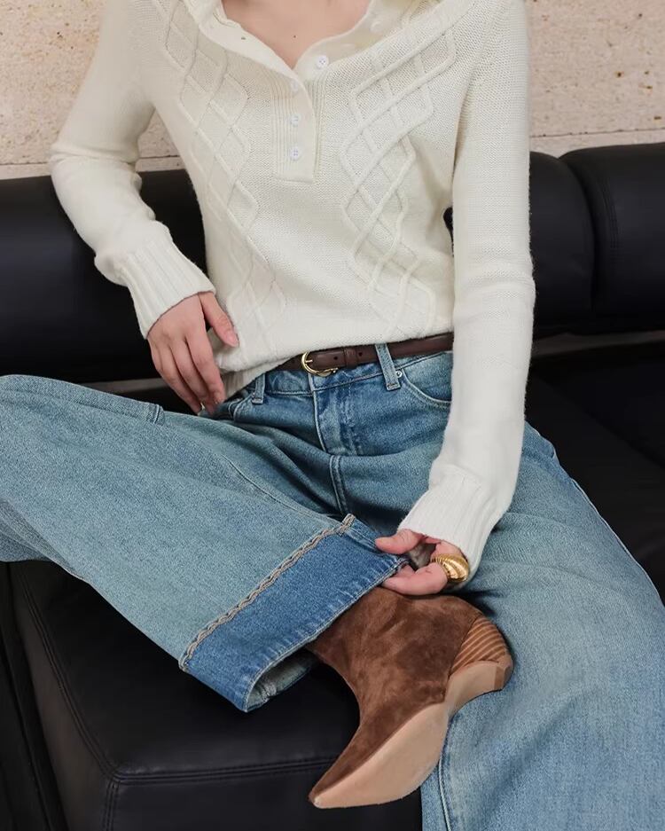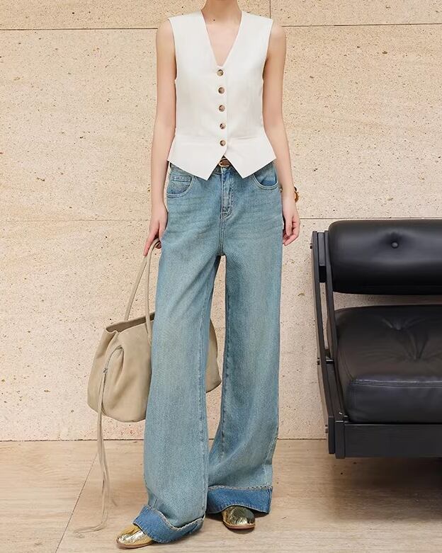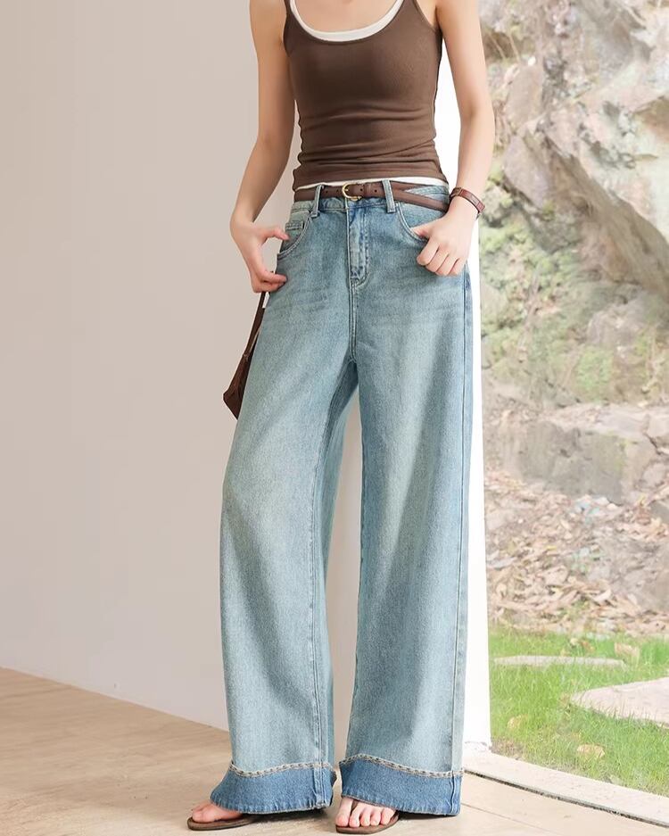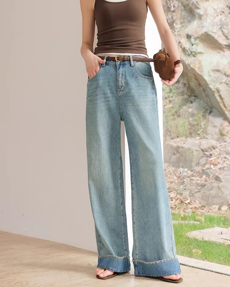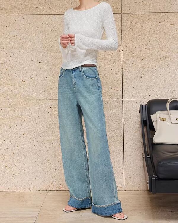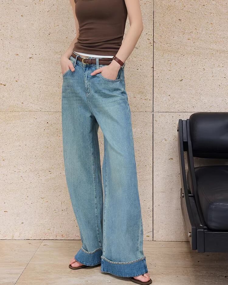 ロールアップされた裾が特徴的なワイドデニムパンツ。シンプルながらも個性を演出し、コーディネートの主役になること間違いなし。トップスを選ばない着回し力の高さも魅力です。