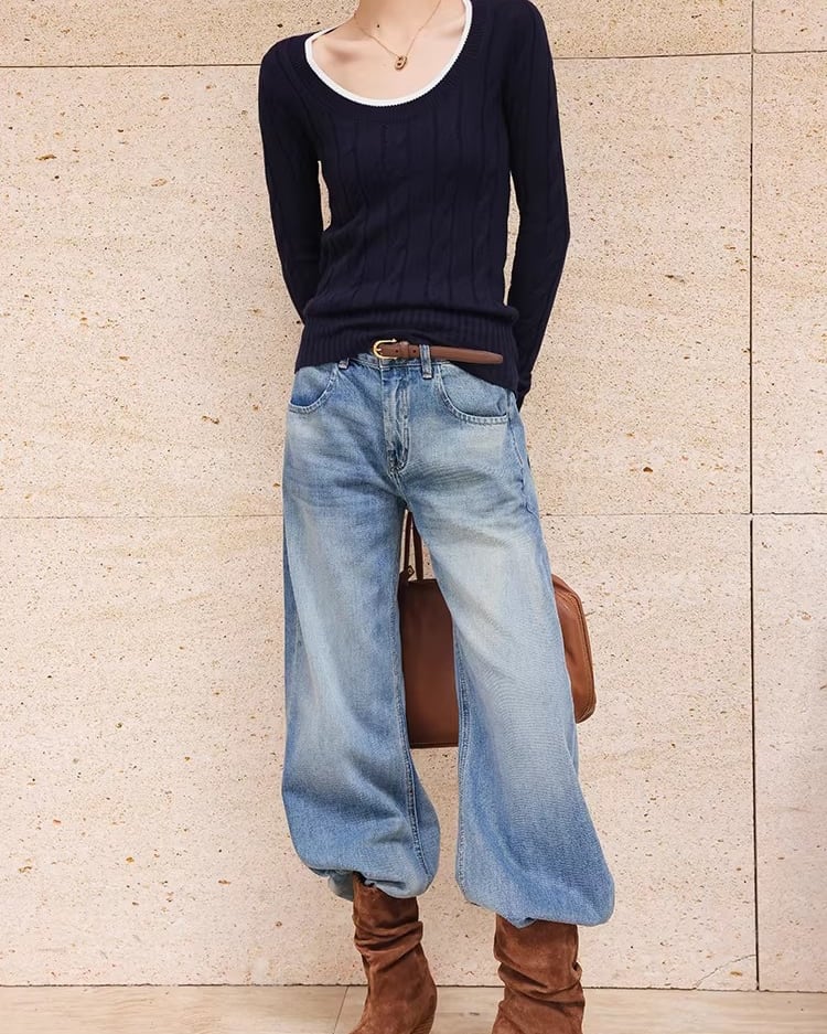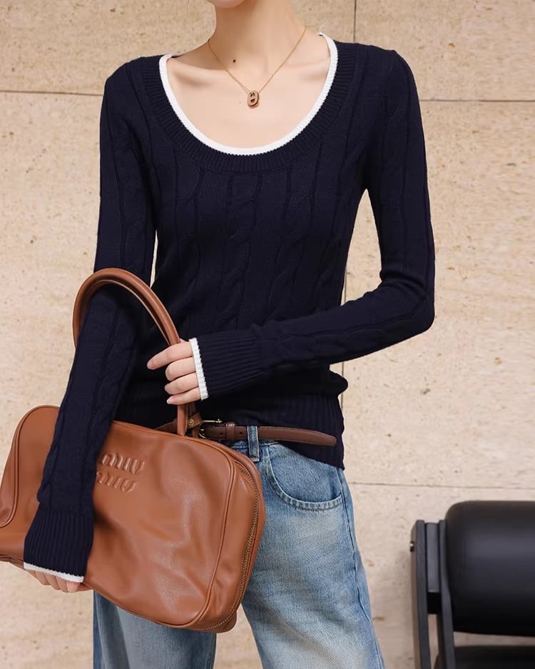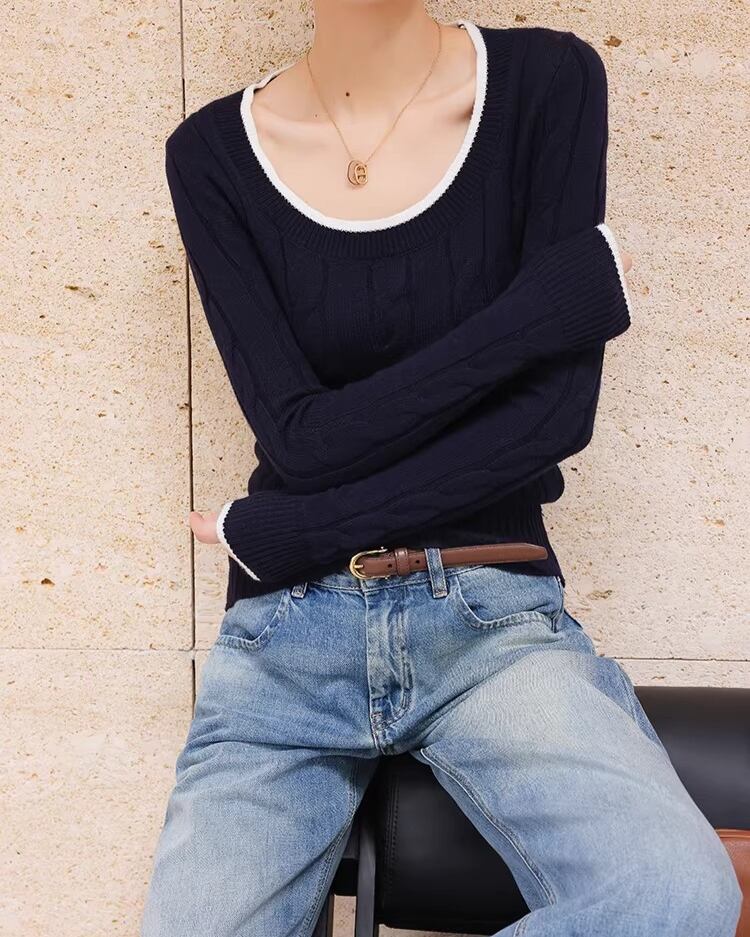カジュアルながらも洗練された印象を与える、長袖クルーネックニットプルオーバー。シンプルながらも存在感のあるケーブル編みが、コーディネートのアクセントになります。デニムやスカートなど、どんなボトムスとも相性抜群です。