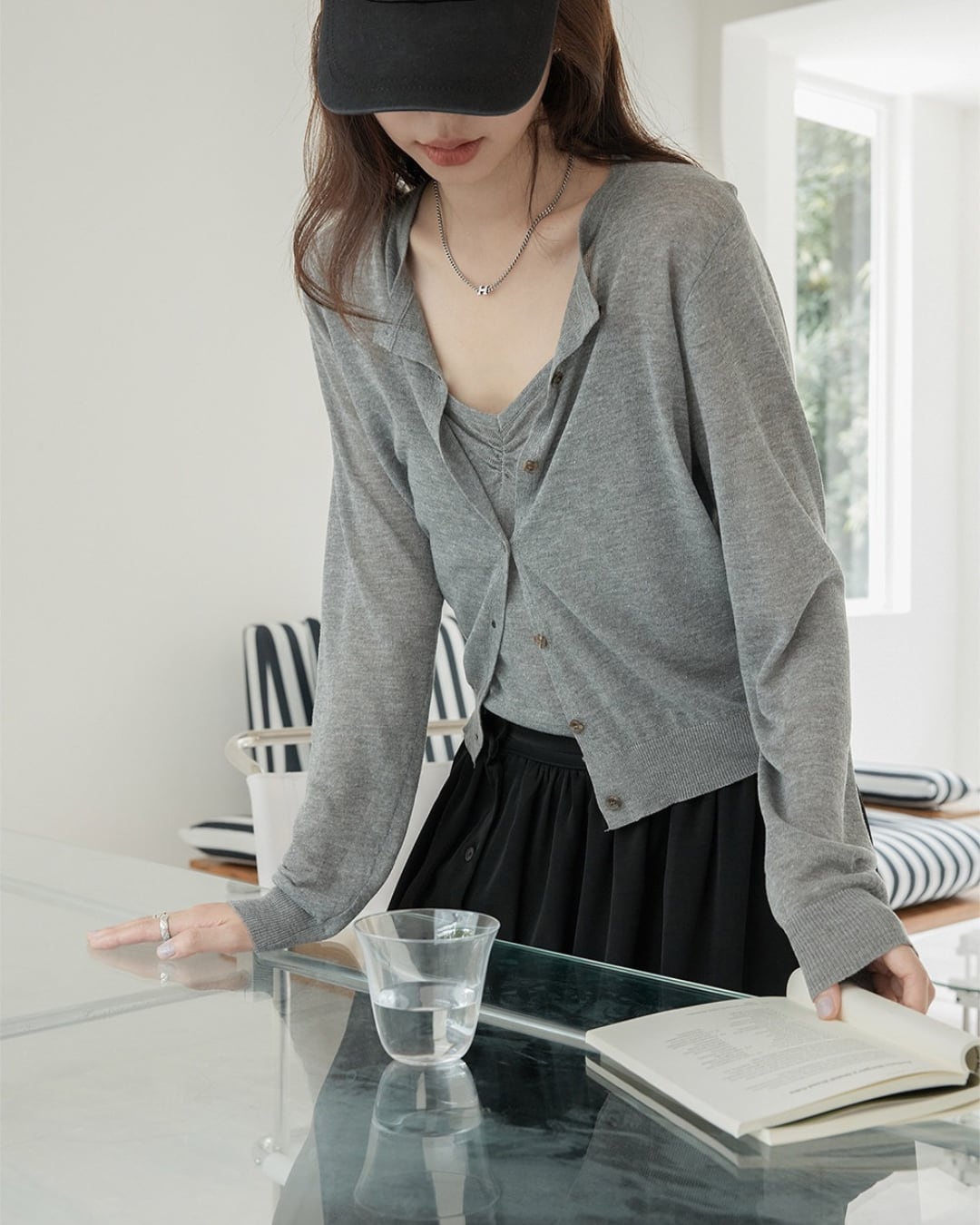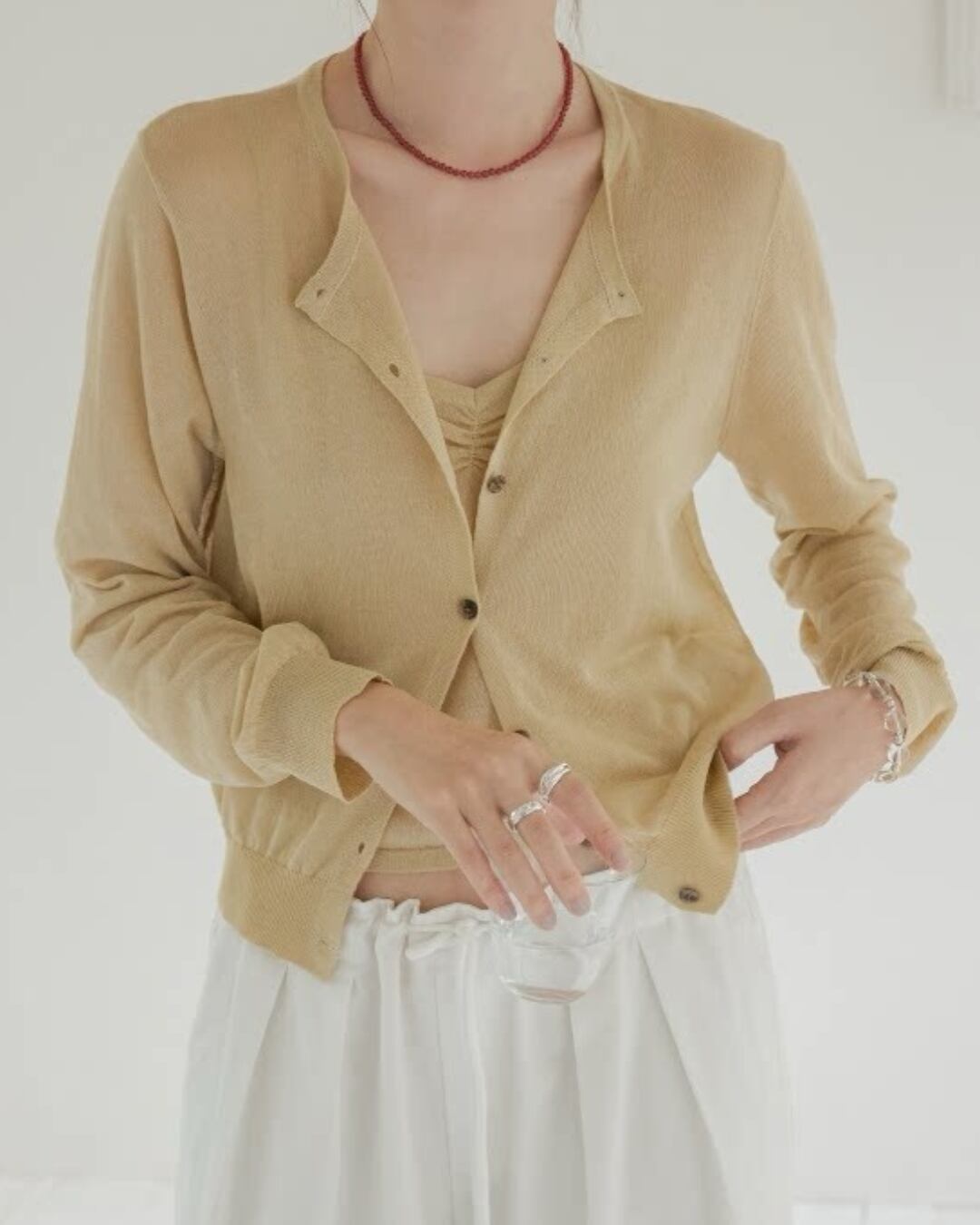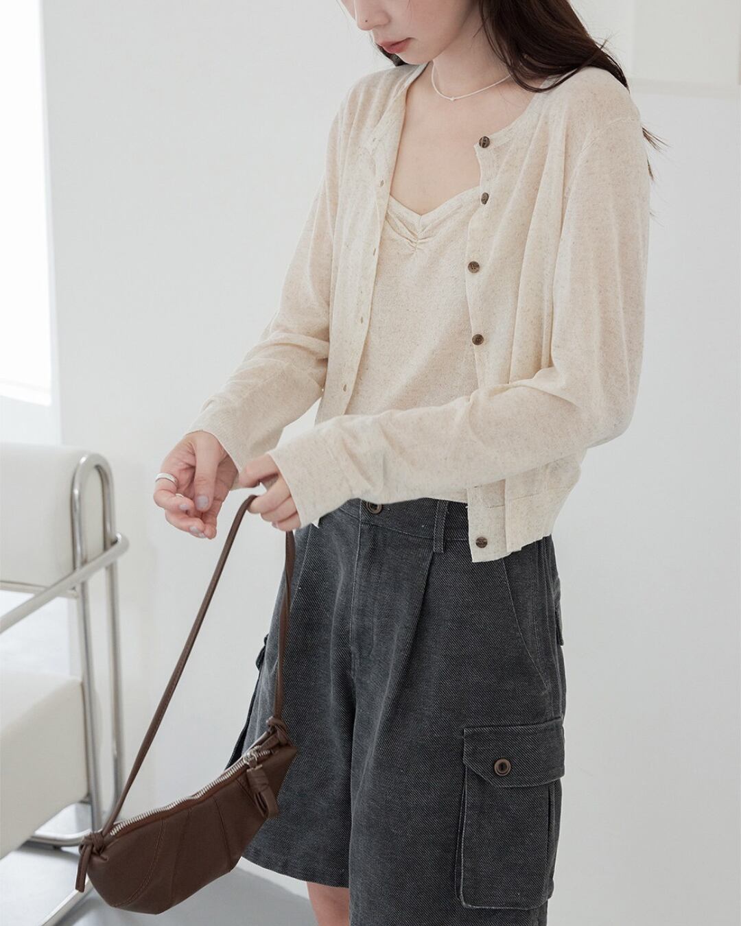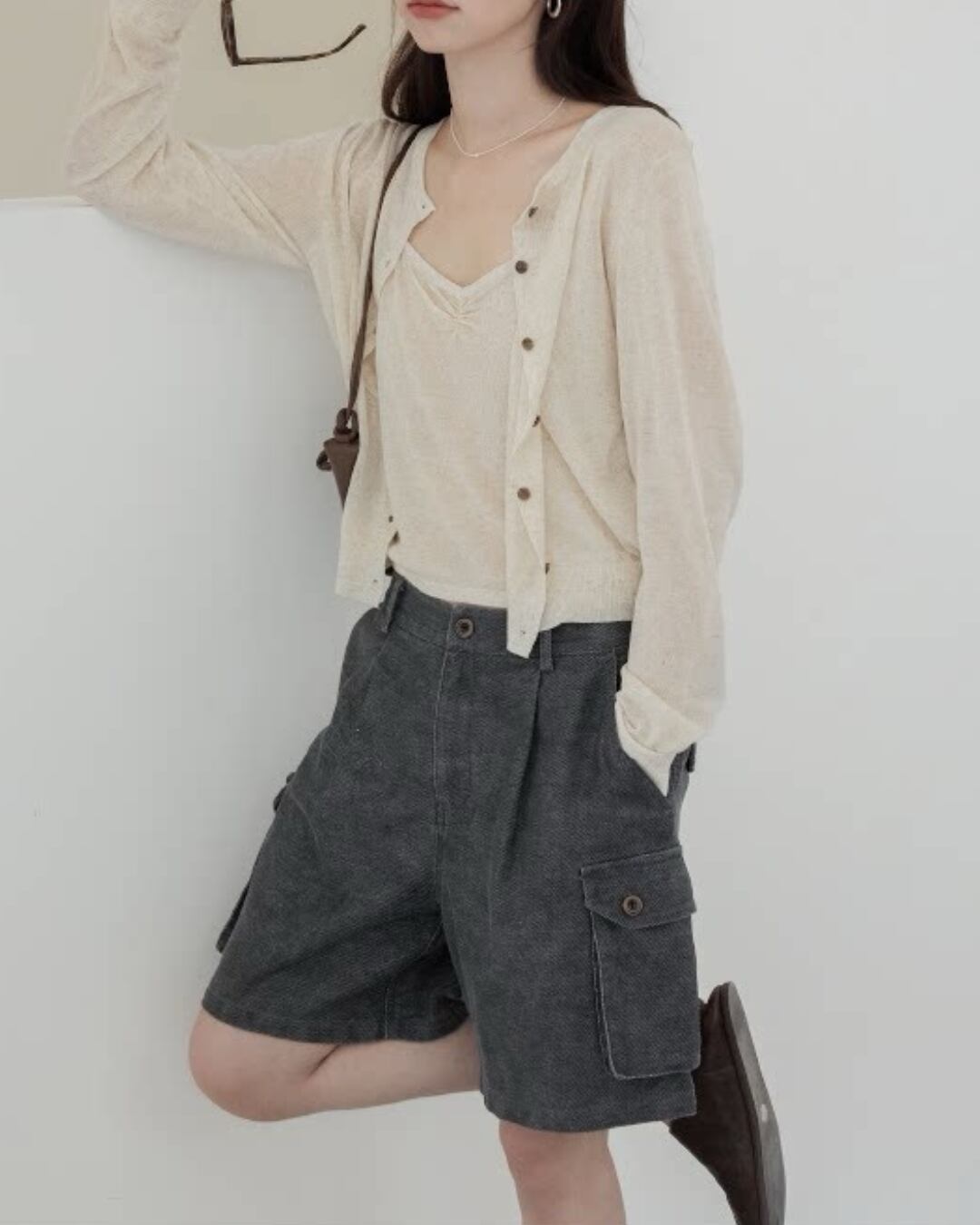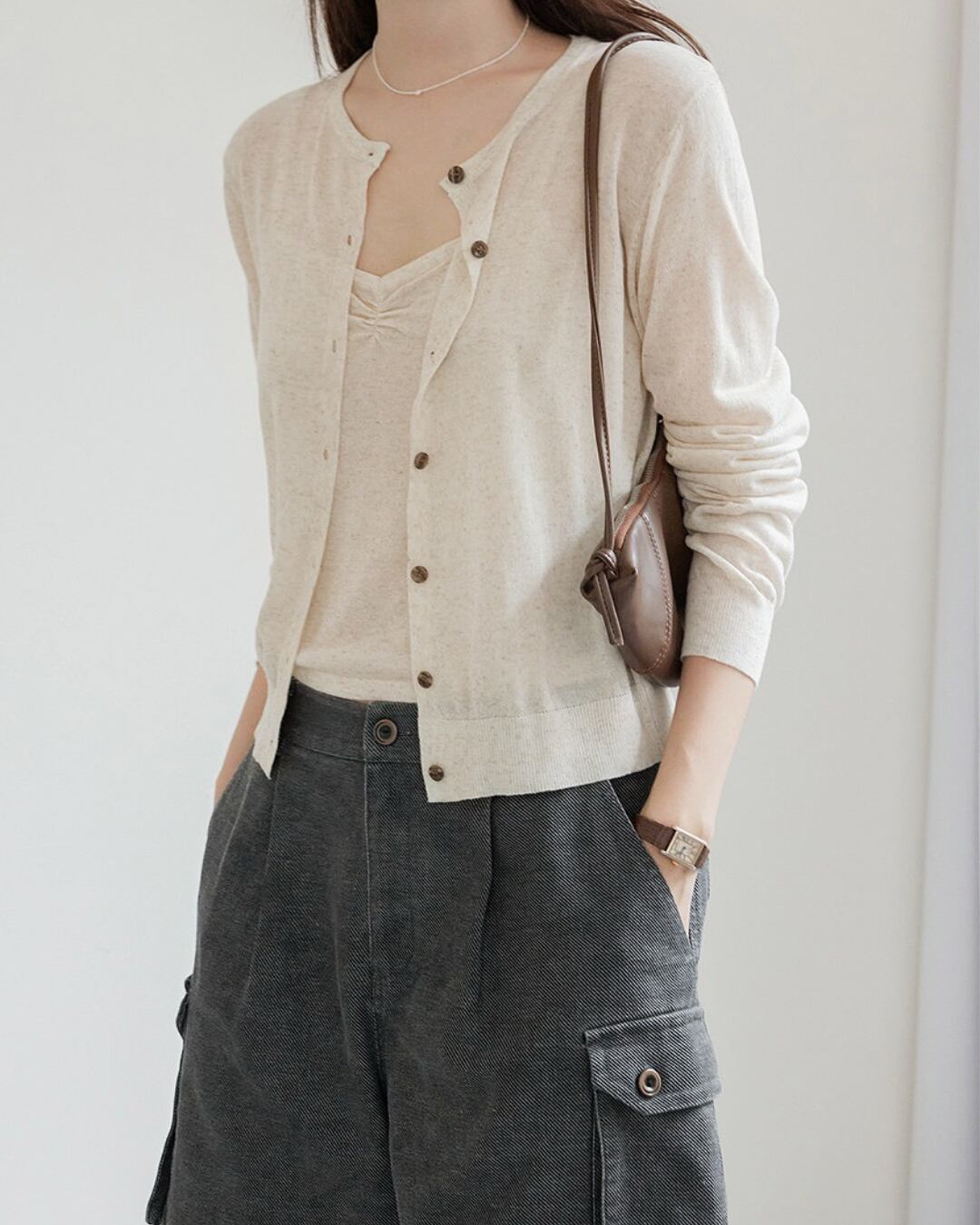 クロップド丈でスタイルアップ効果もある長袖カーディガン。