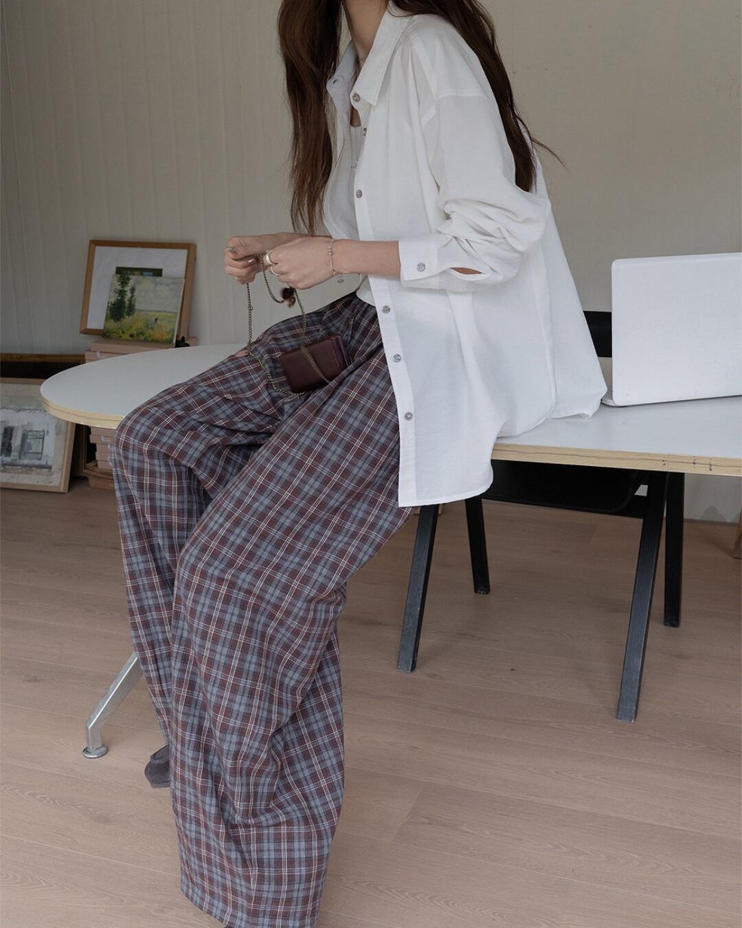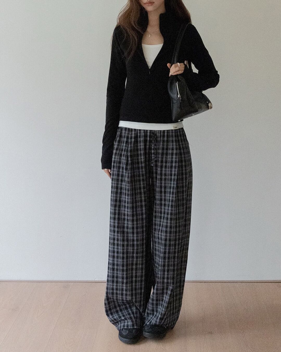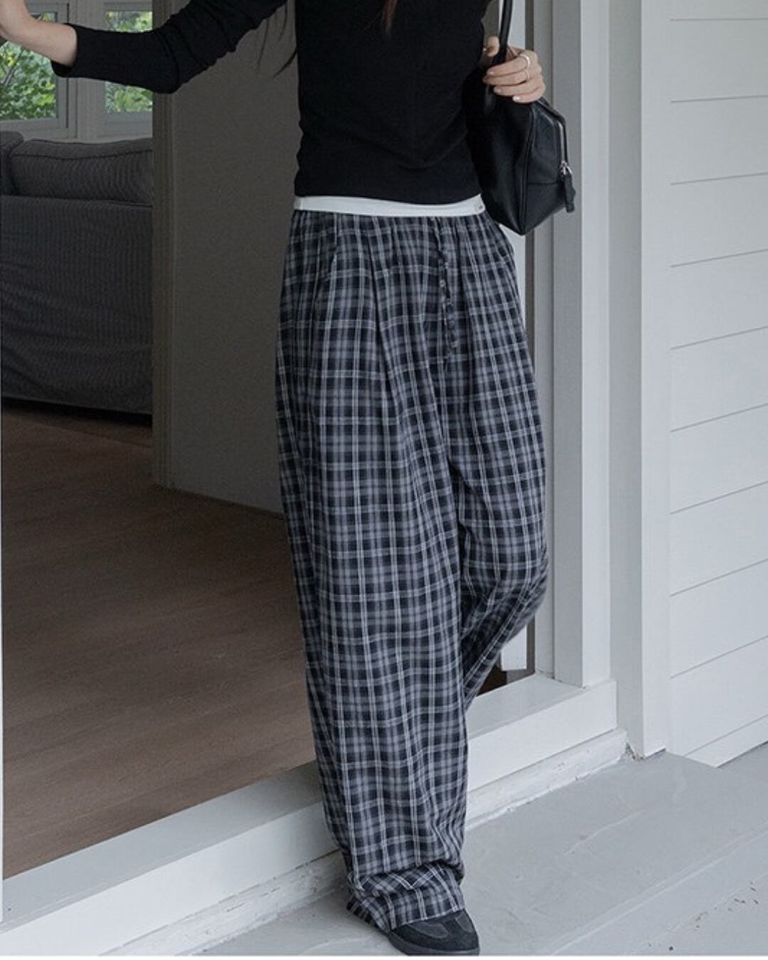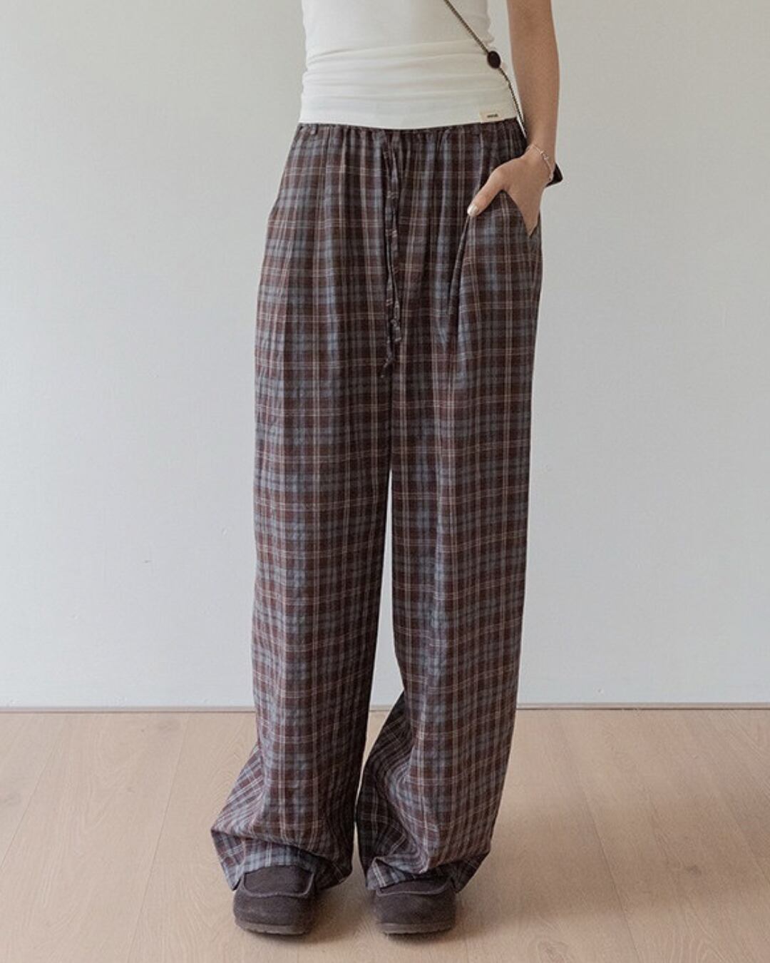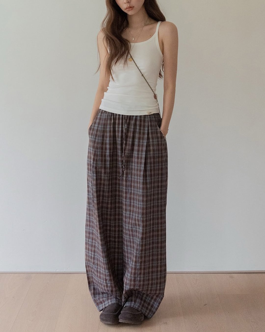チェック柄が目を引く、マキシ丈のワイドパンツ。ドローストリング仕様でウエスト調整が可能なため、様々な体型の方にフィットします。カジュアルなトップスと合わせれば、こなれ感のあるスタイリングが完成します。