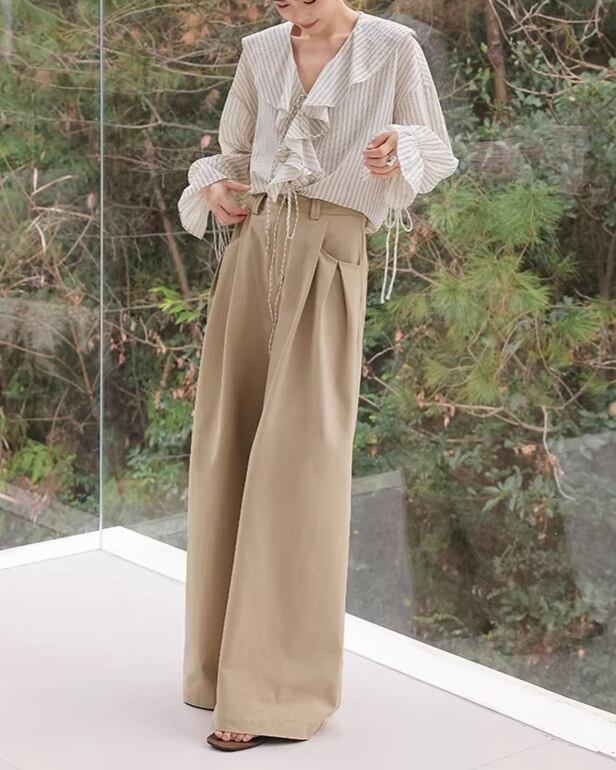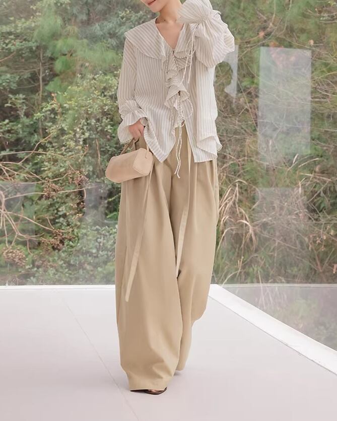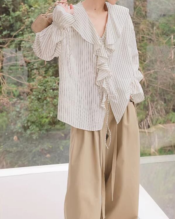 ストライプ柄が爽やかな印象を与えるブラウス。フリルがあしらわれたデザインで、フェミニンな着こなしが叶います。袖口のリボンがアクセントとなり、より一層おしゃれ度をアップ。普段使いはもちろん、少し上品な装いにもおすすめです。