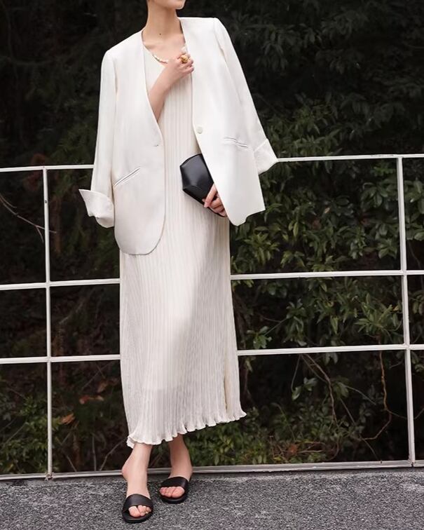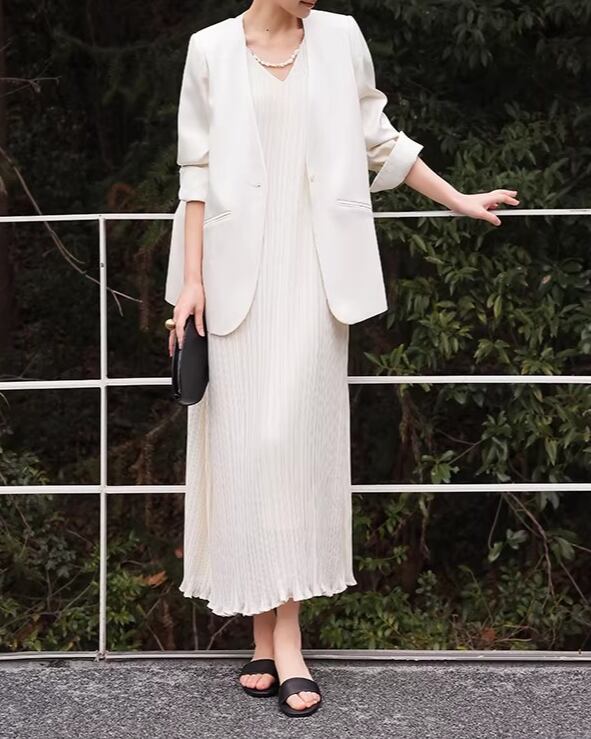 シンプルなデザインながらも、上品さを演出するロングドレス。深すぎないVネックがデコルテを美しく見せ、女性らしさを引き立てます。アクセサリーやバッグをプラスして、自分らしい着こなしを楽しめます。