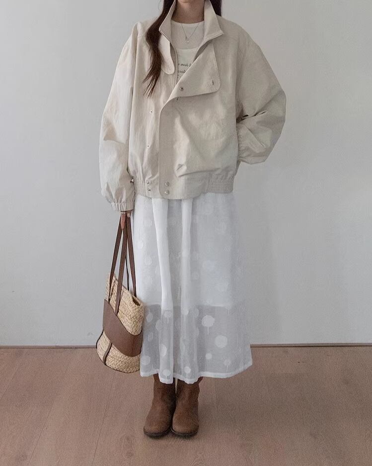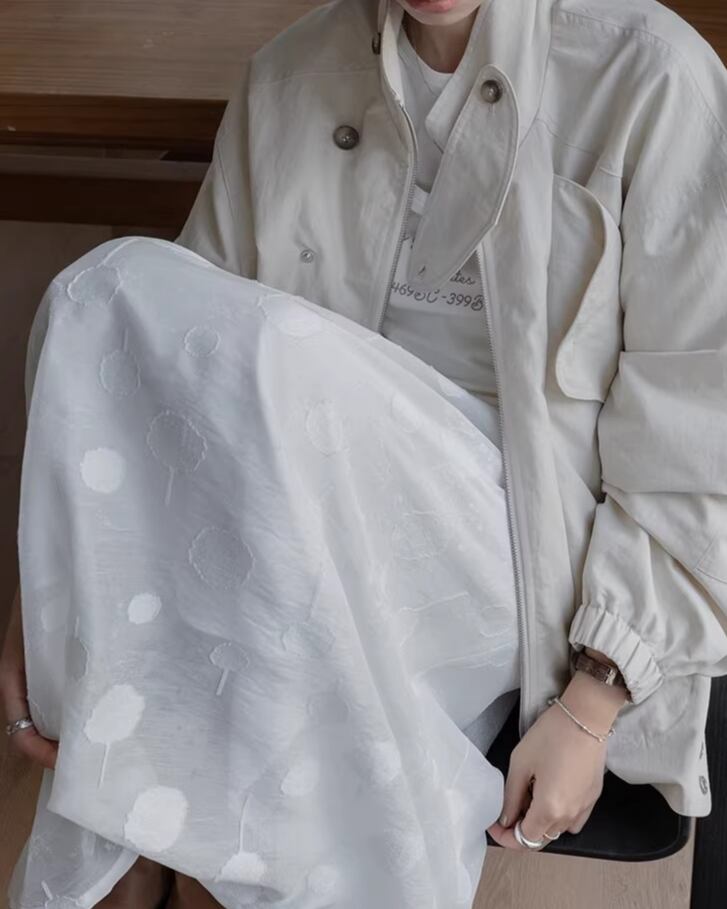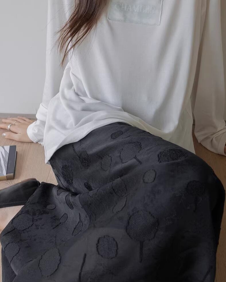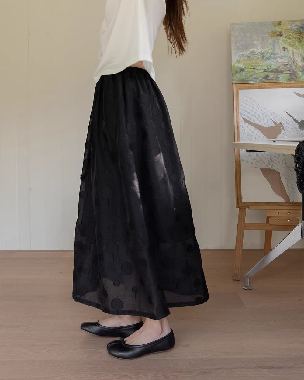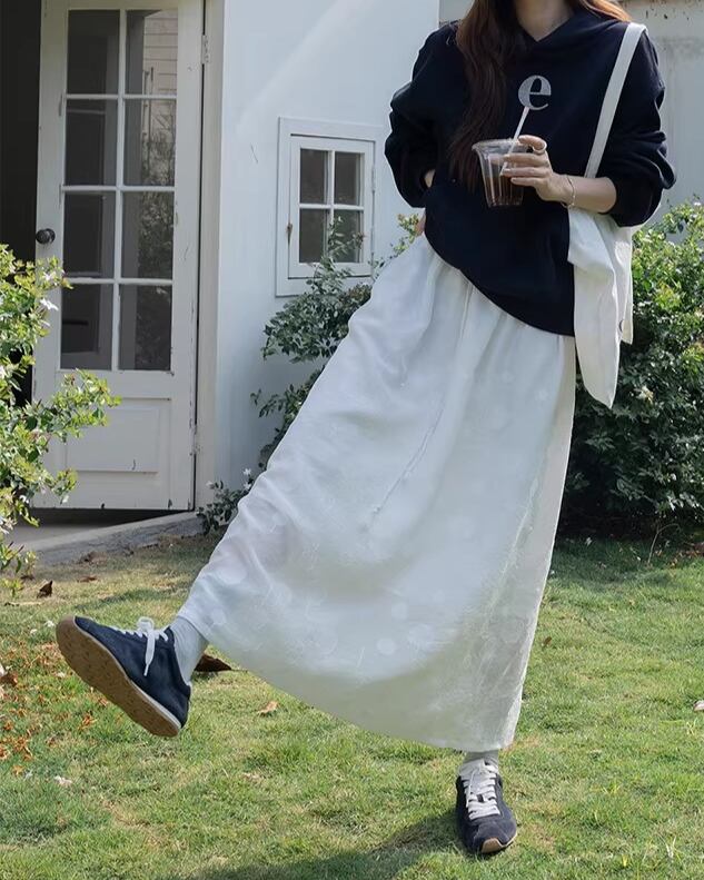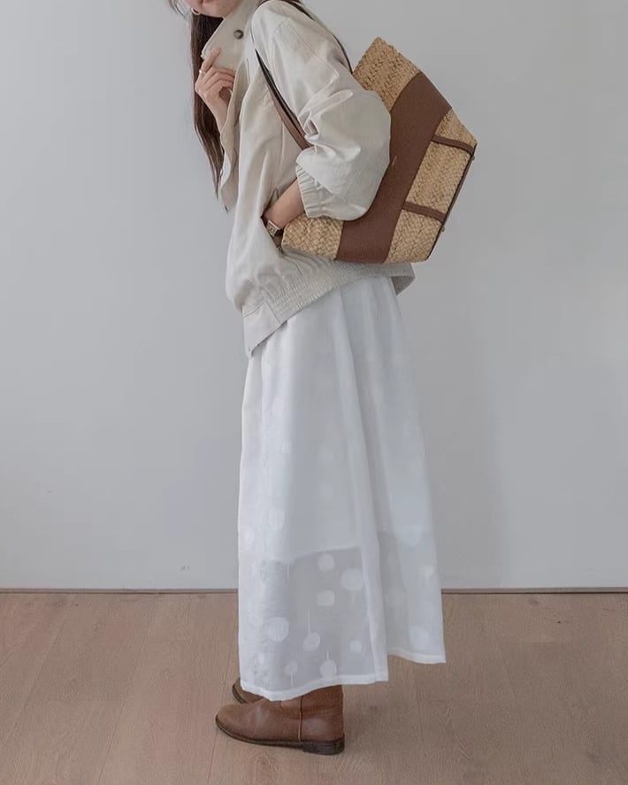 ミディ丈で上品な印象を与えつつ、動くたびに軽やかに揺れるフレアシルエットが魅力的です。