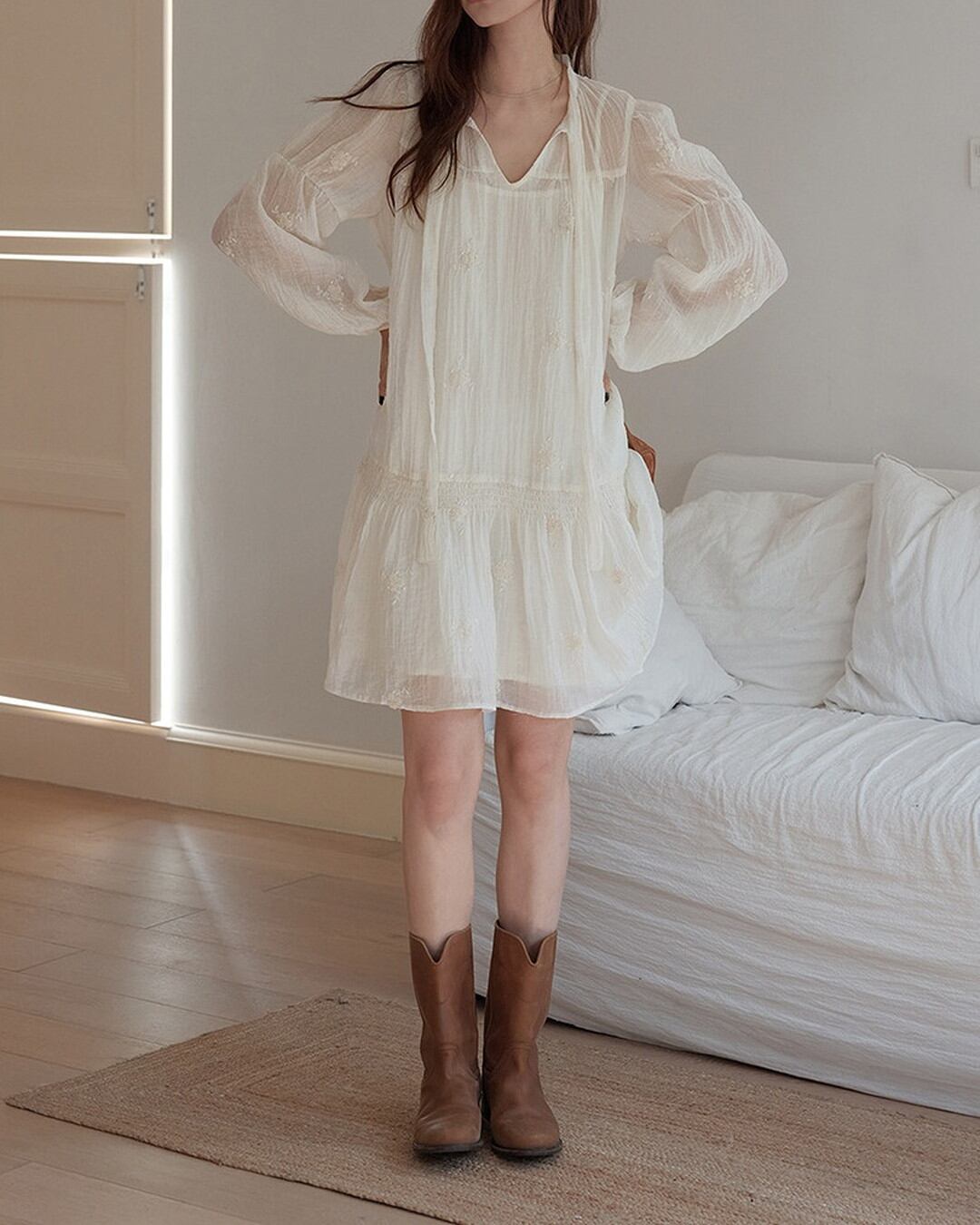 Embroidery shirring mini sheer One-piece L0060