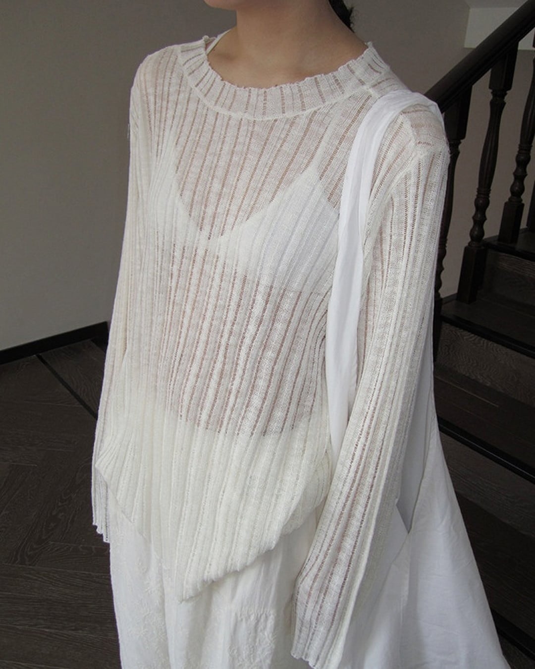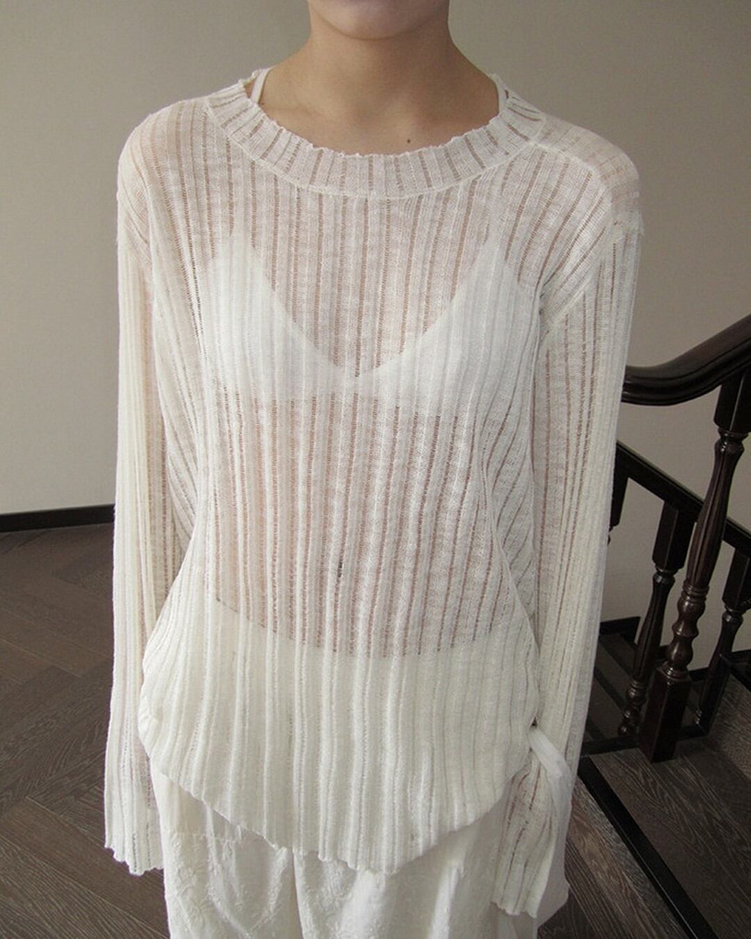 Sheer ribbed knit crew-neck Tops L0059