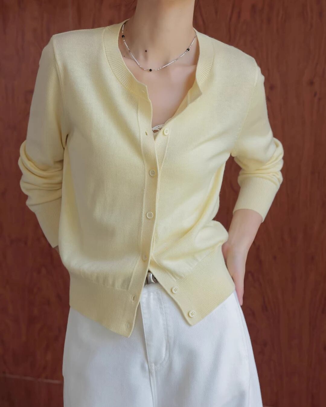 シンプルなデザインが魅力の長袖ショートニットカーディガン。