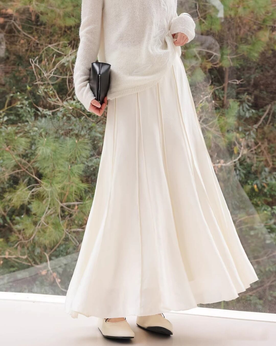 歩くたびに揺れる裾が美しい、存在感のあるマキシ丈のプリーツスカート。