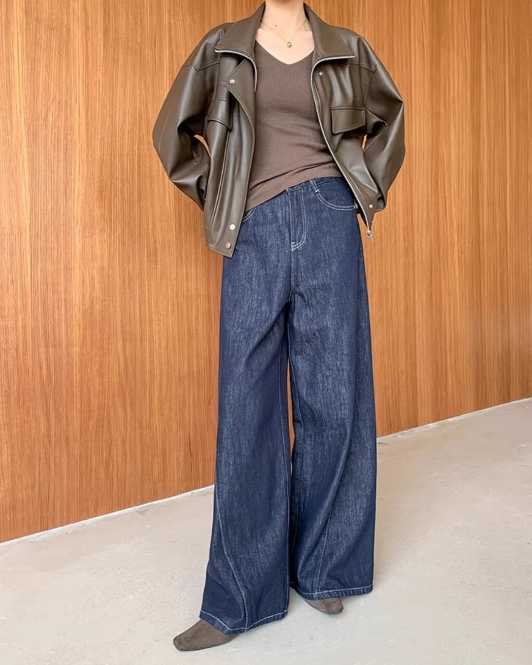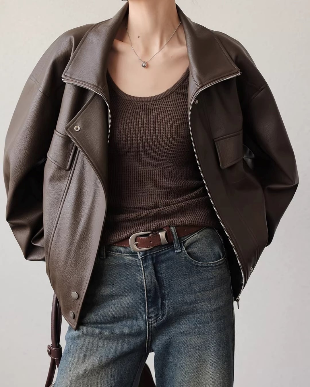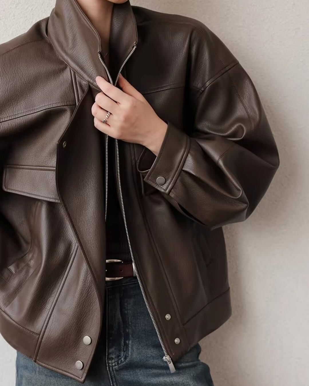 たっぷりとしたボリュームスリーブが目を惹く、存在感抜群のレザージャケット。
