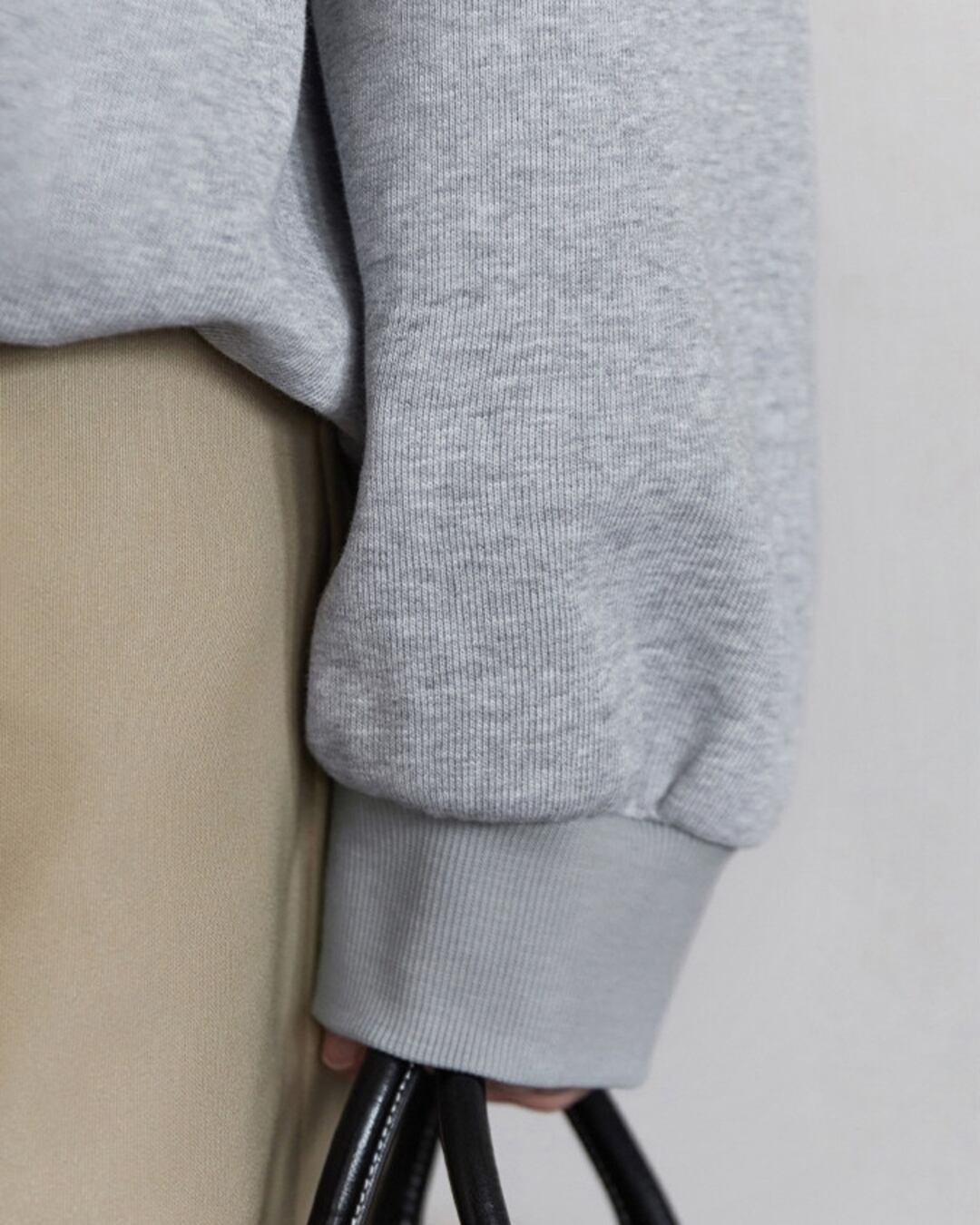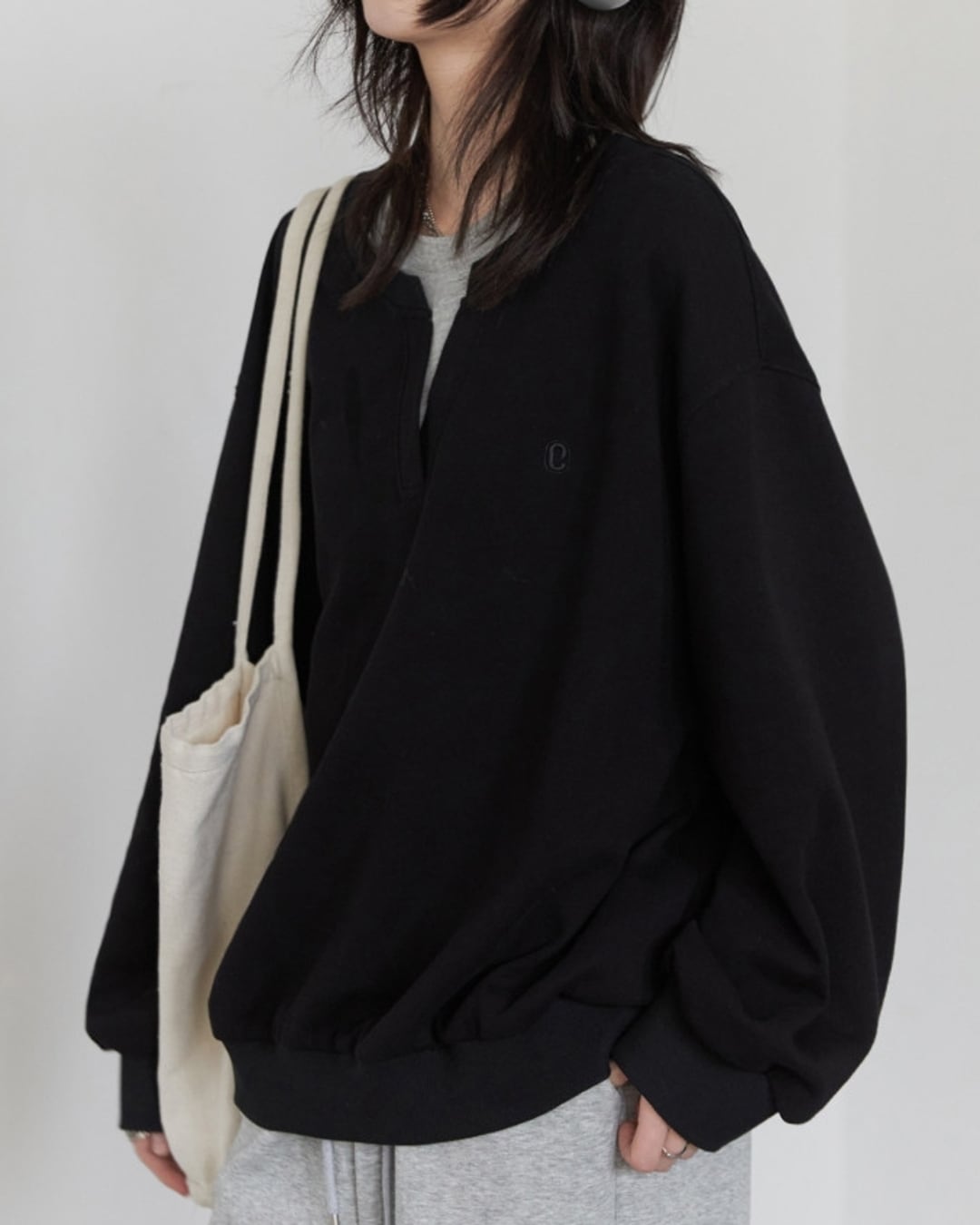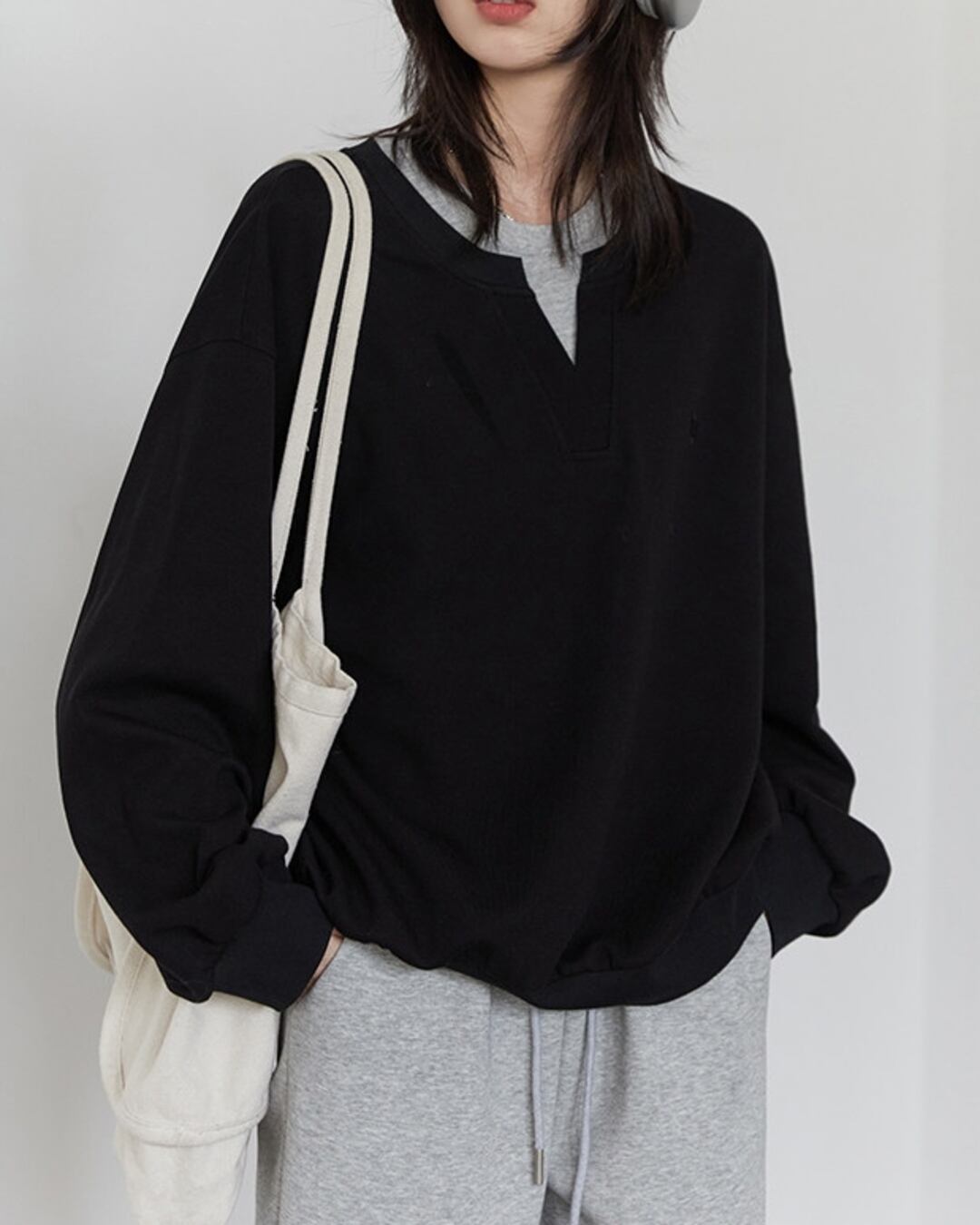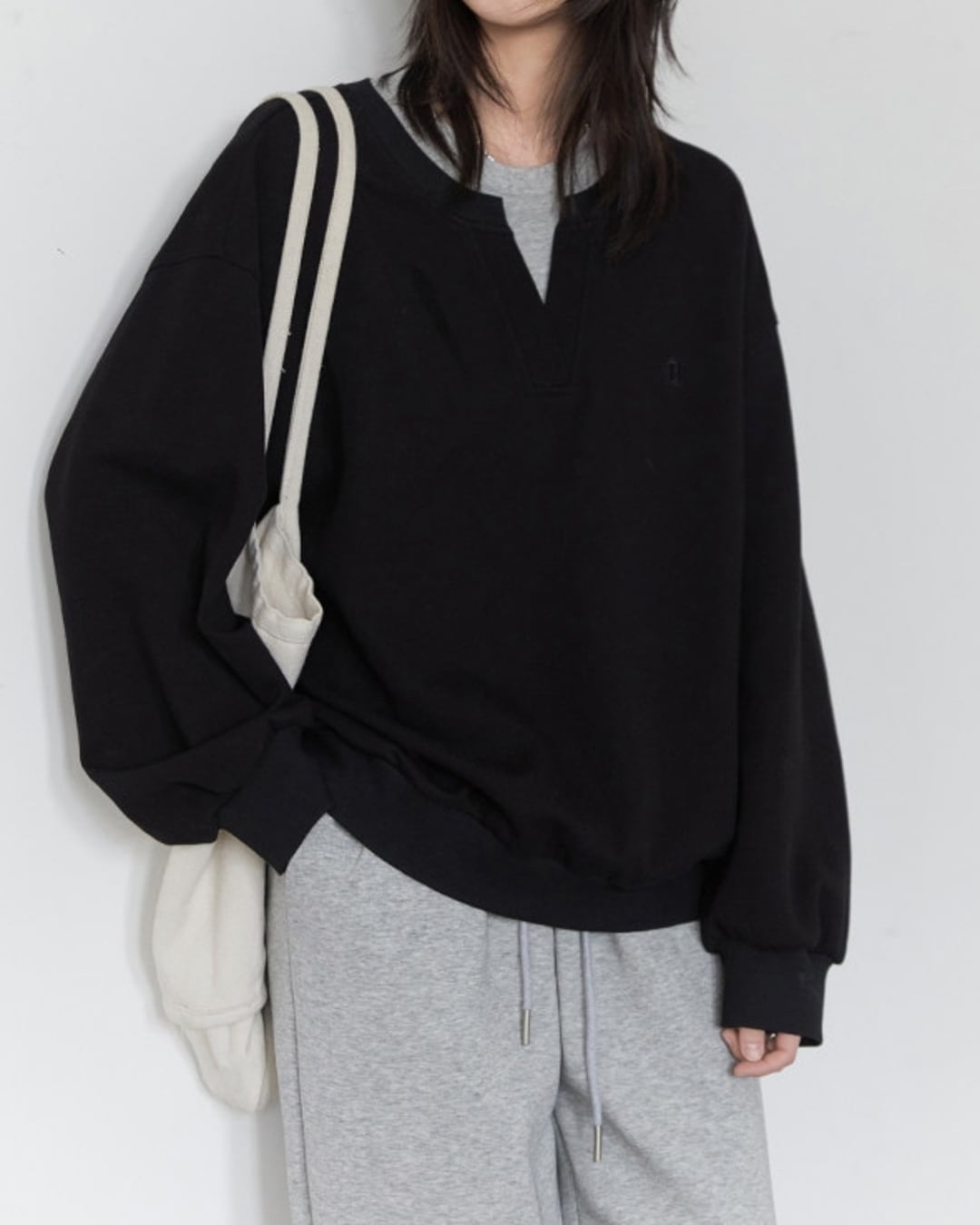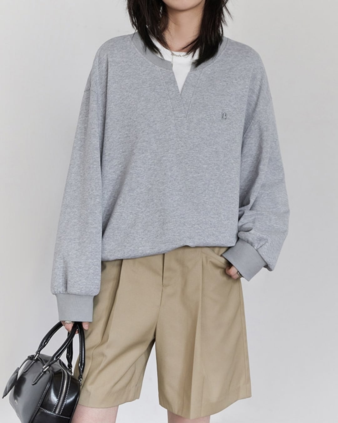 レイヤード風のVネックデザインが特徴的な、ヒップ丈のスウェットトップスです。