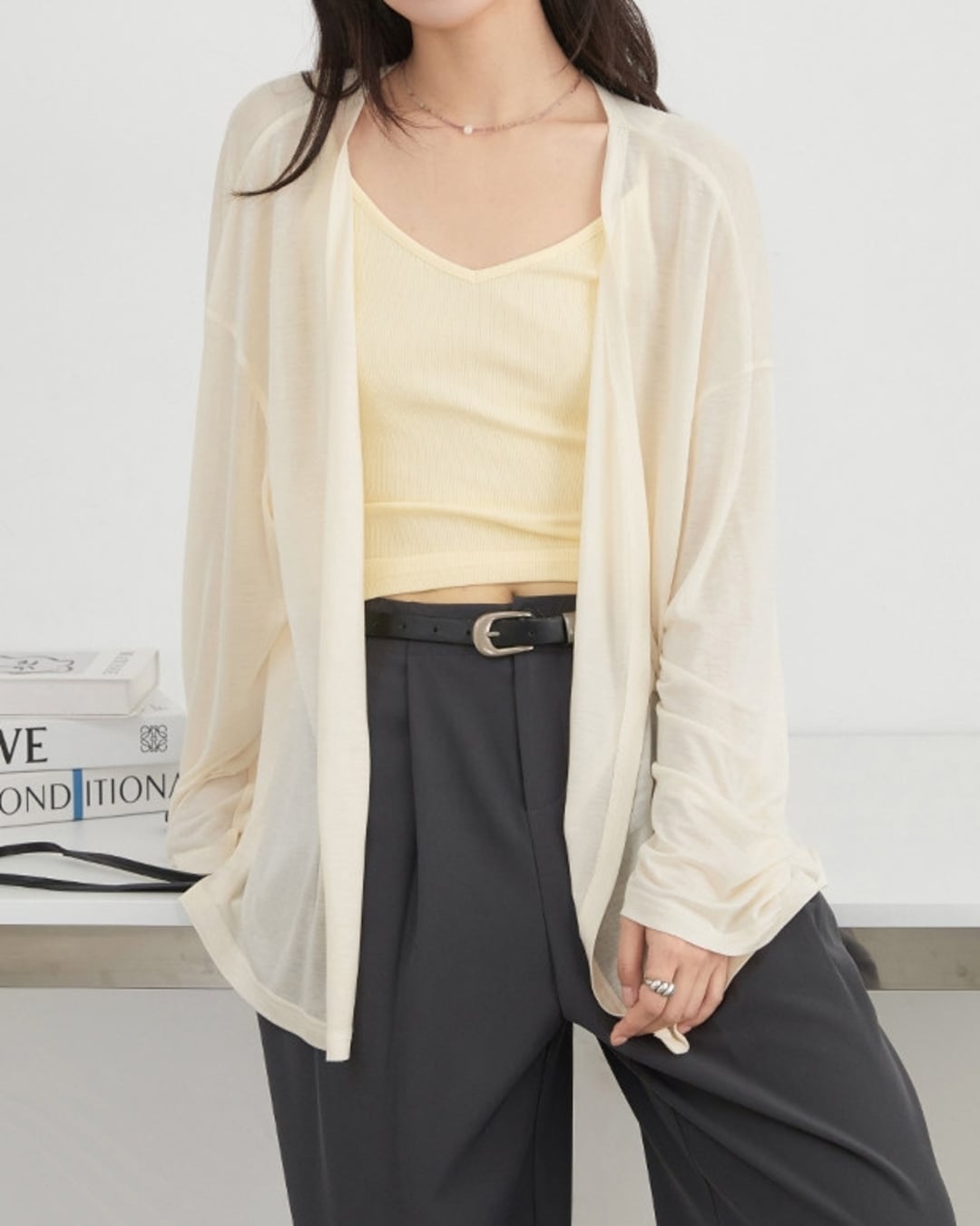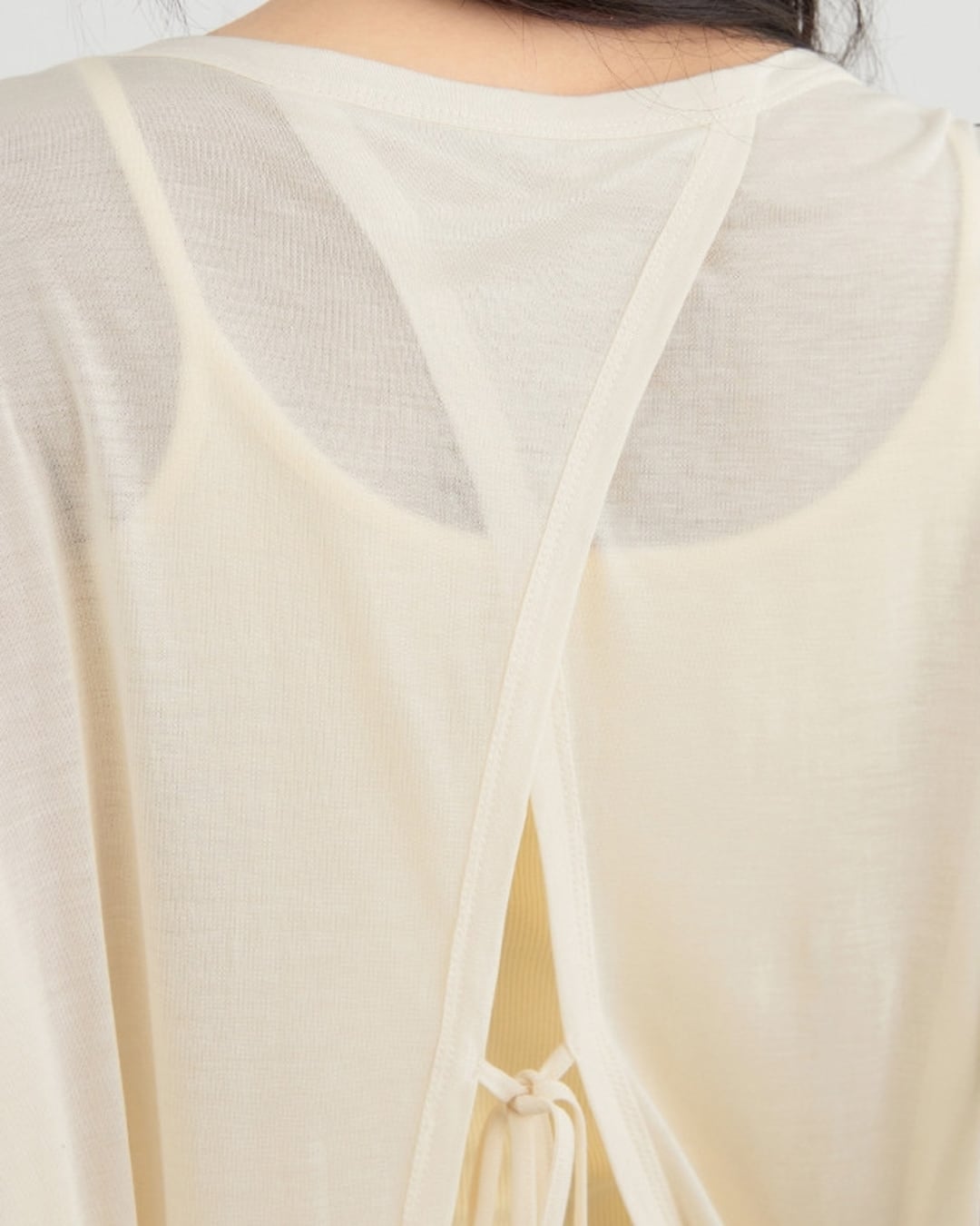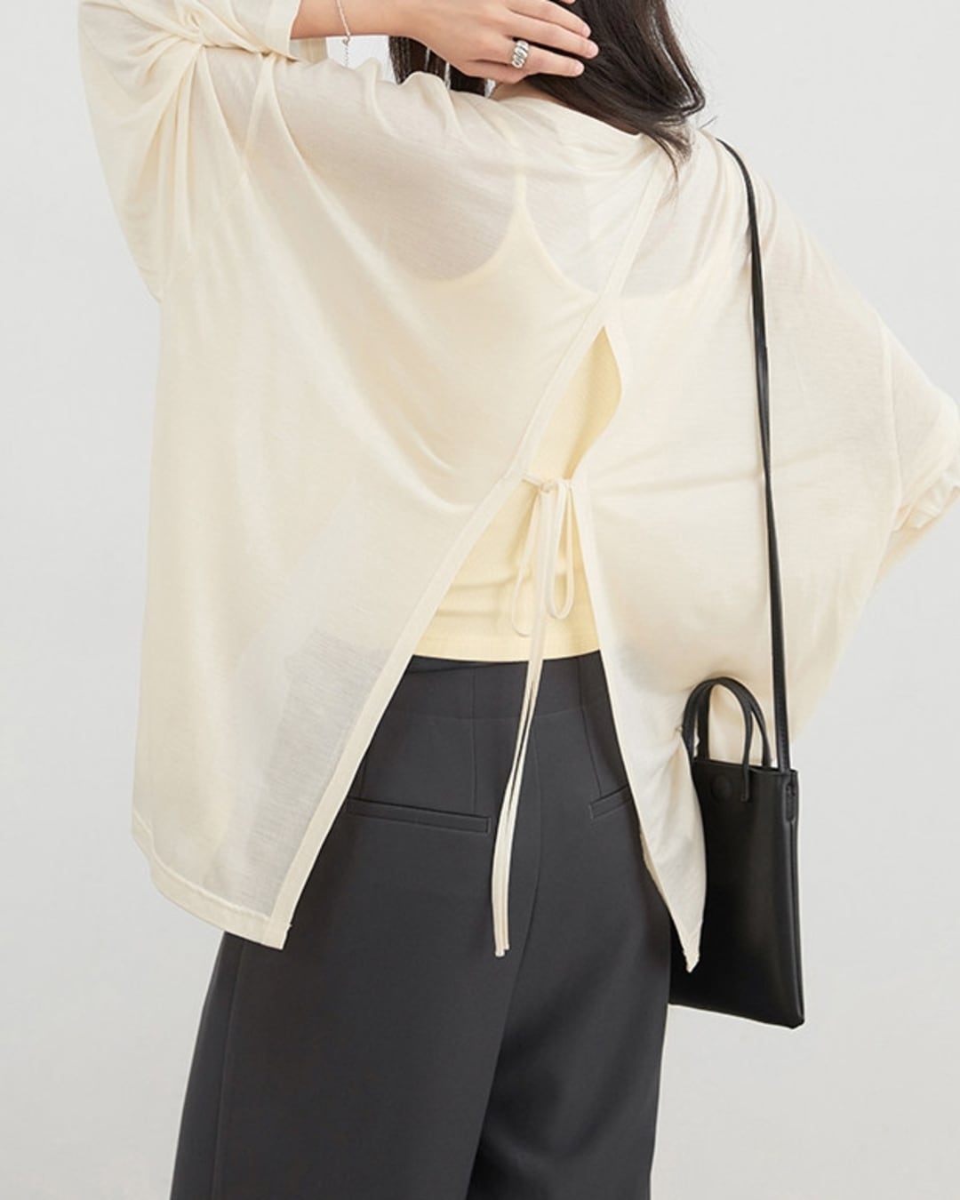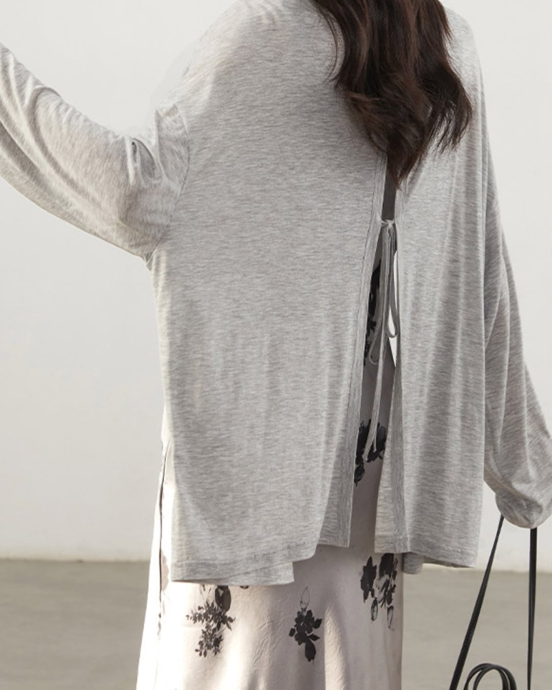 バックスタイルのリボンがポイントのゆったりオーバーサイズのこなれたカーディガン。