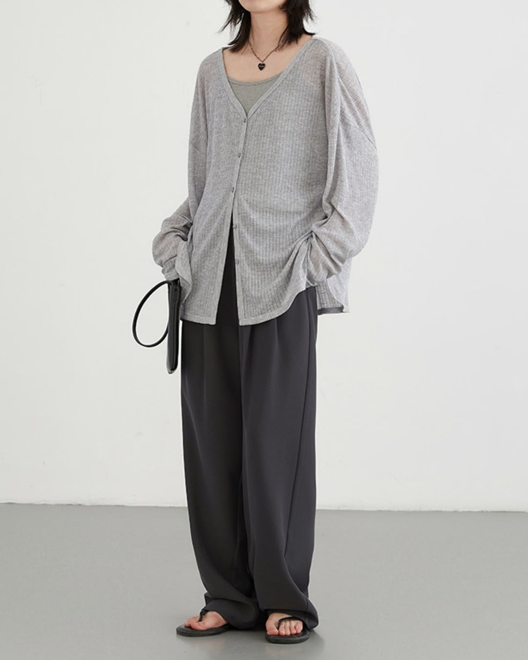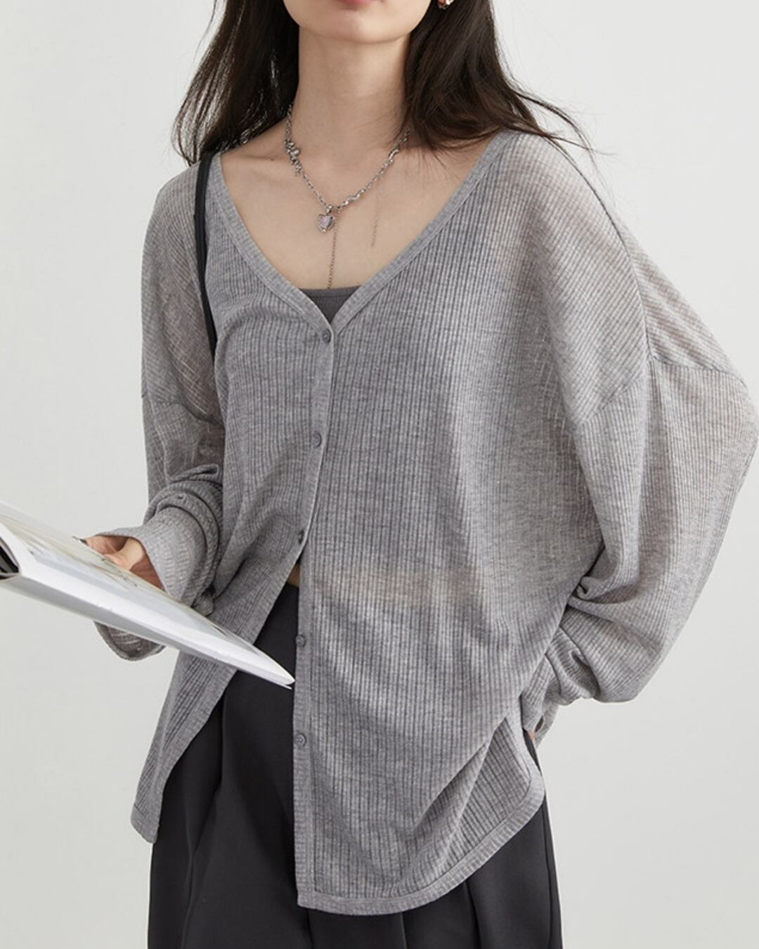 ボタンフロントのやや透け感のあるリブニット長袖カーディガン。