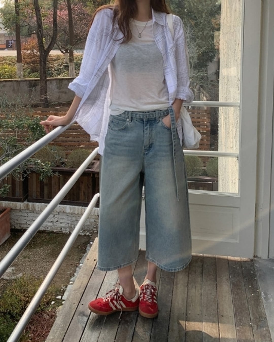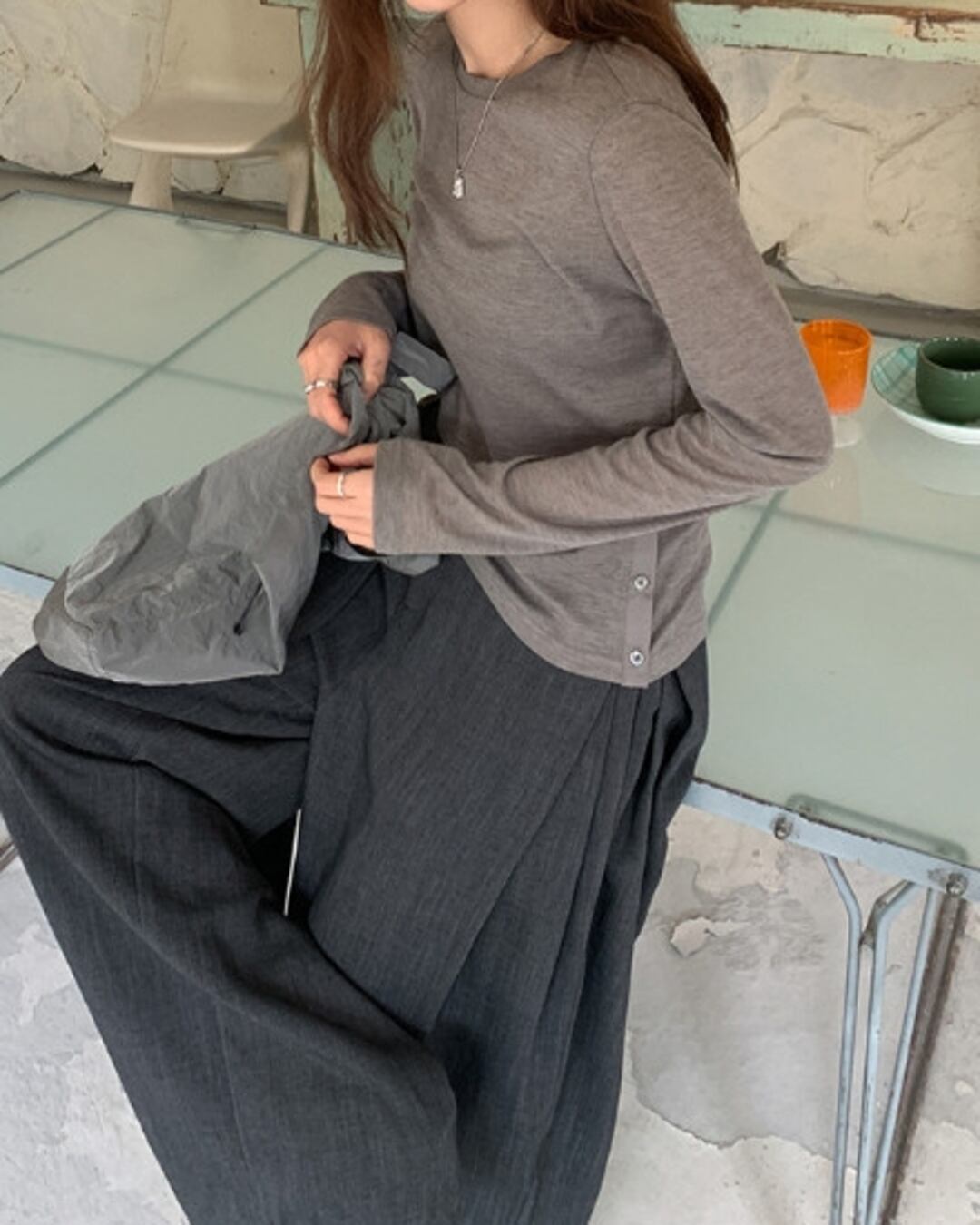 ボタン付きのサイドスリットがさりげないアクセントになり、レイヤードスタイルも軽やかに仕上がります。