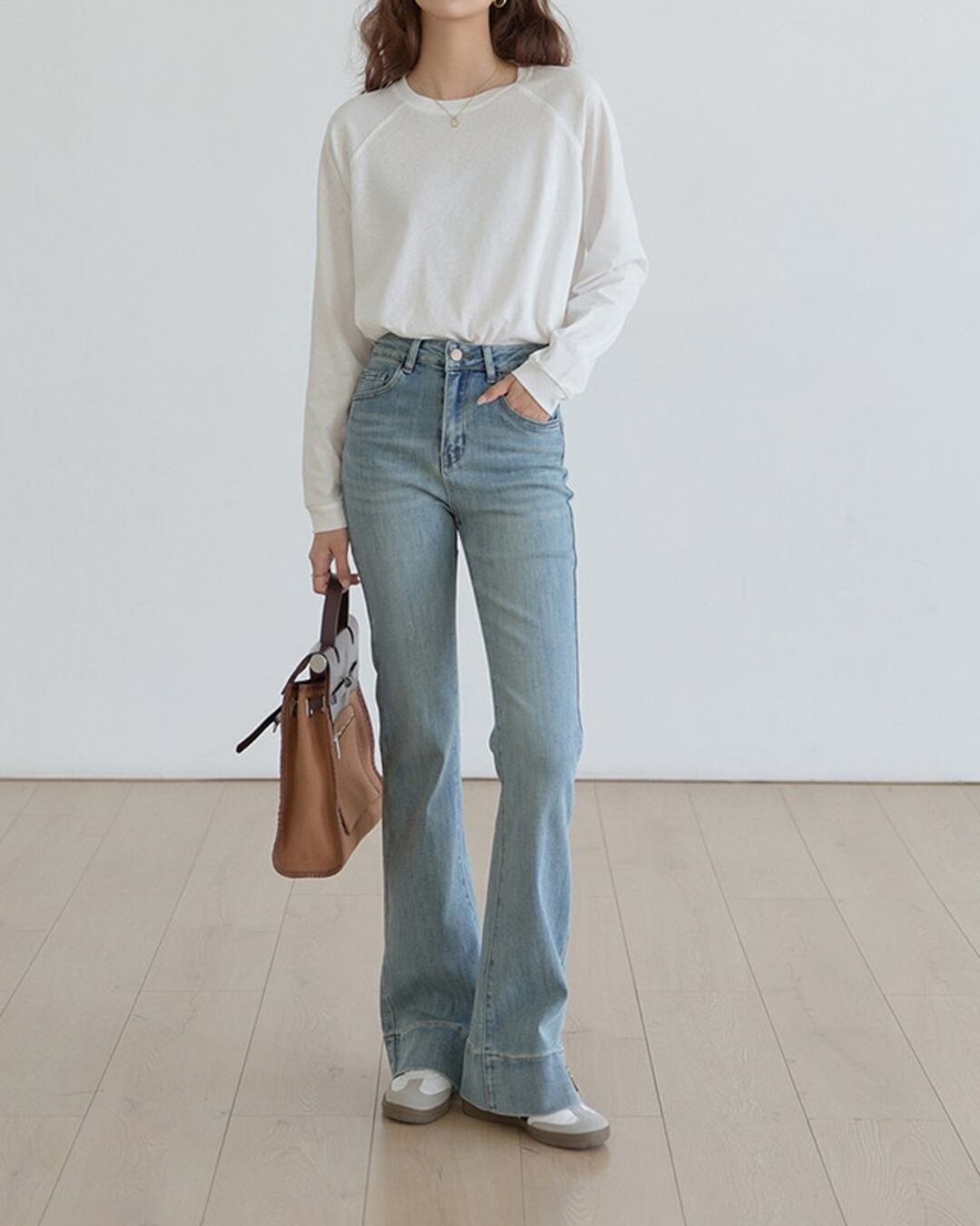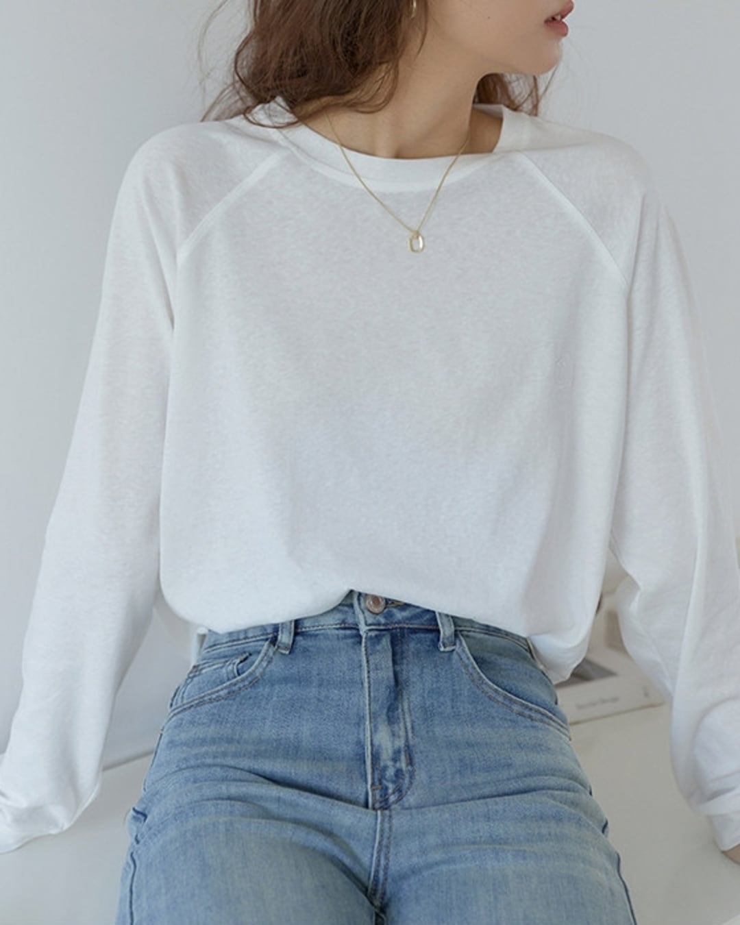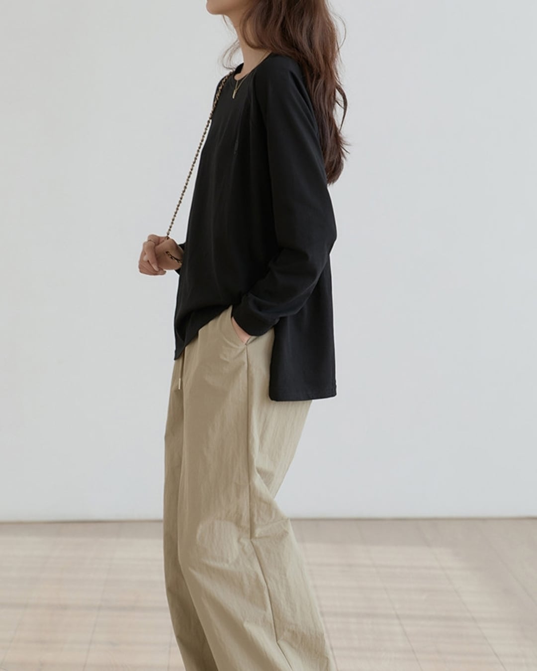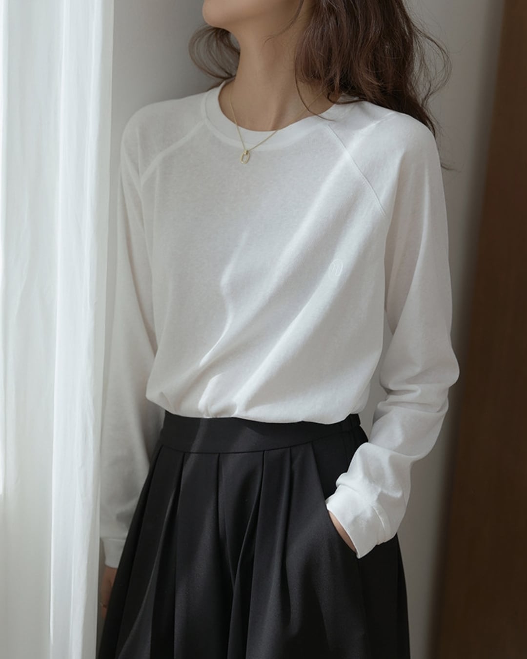 シンプルなクルーネックのサイドスリット入りロングテールTシャツ。