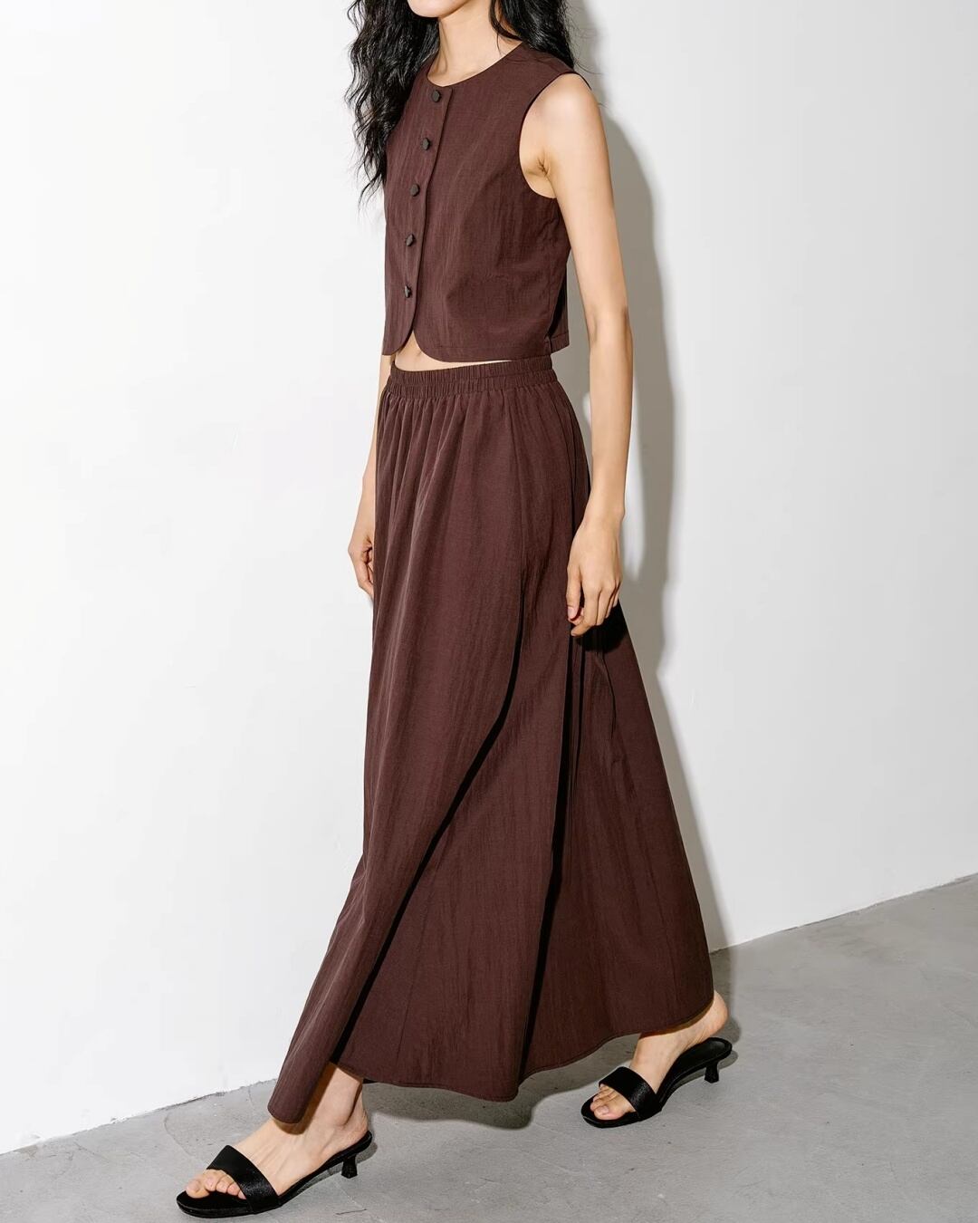 無駄を削ぎ落としたミニマルなデザインが、都会的なムードを放つマキシスカート。