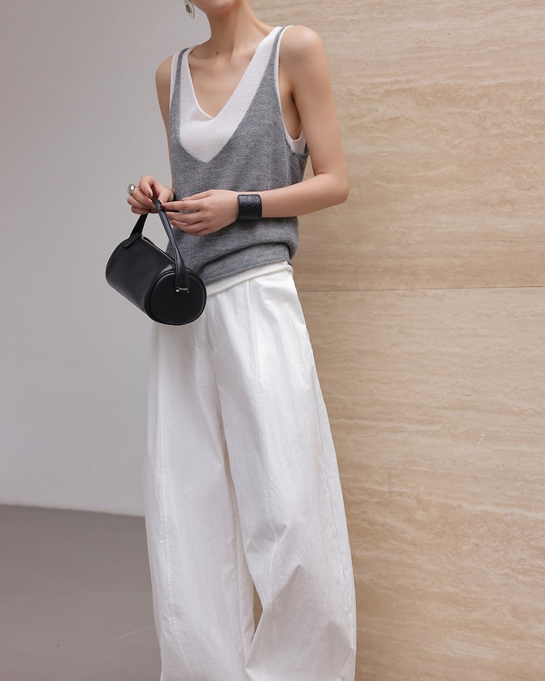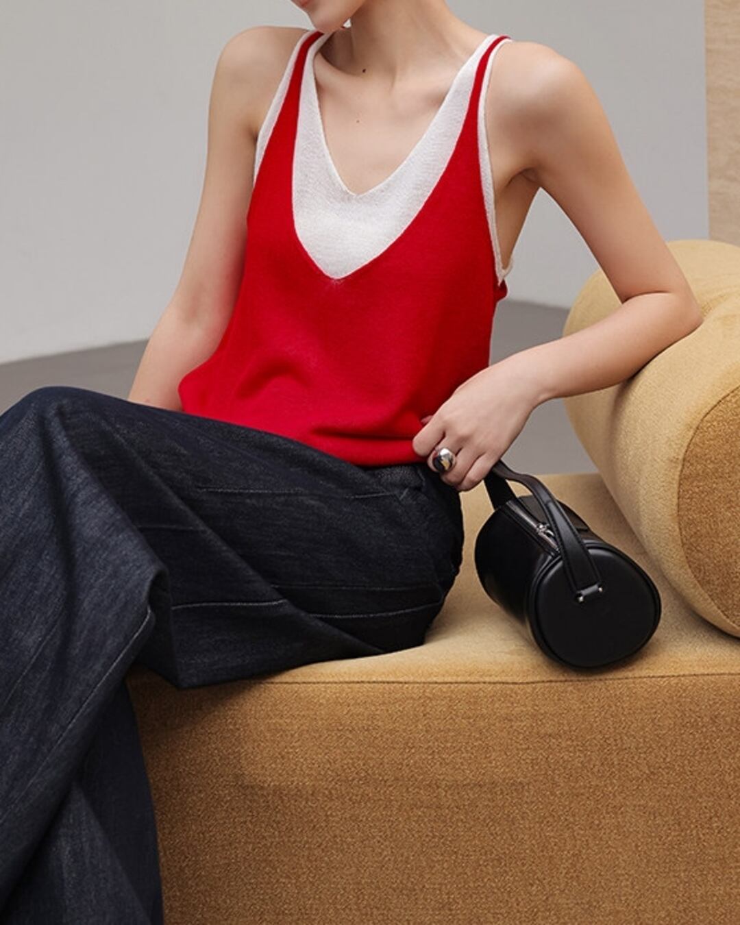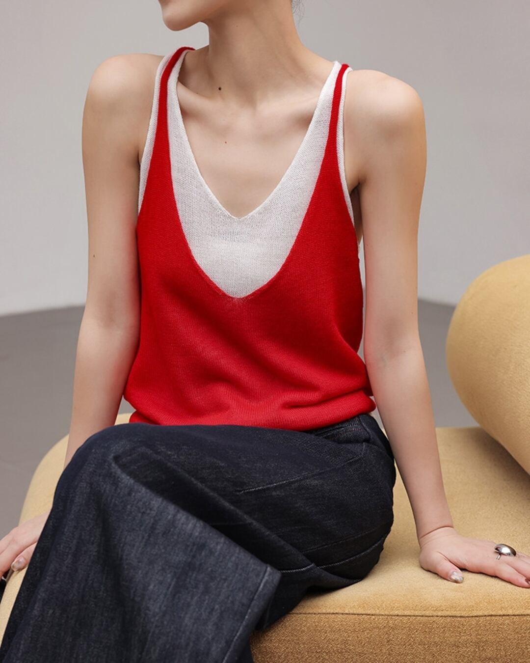 Vネックがデコルテを美しく見せてくれるニットタンクトップ。