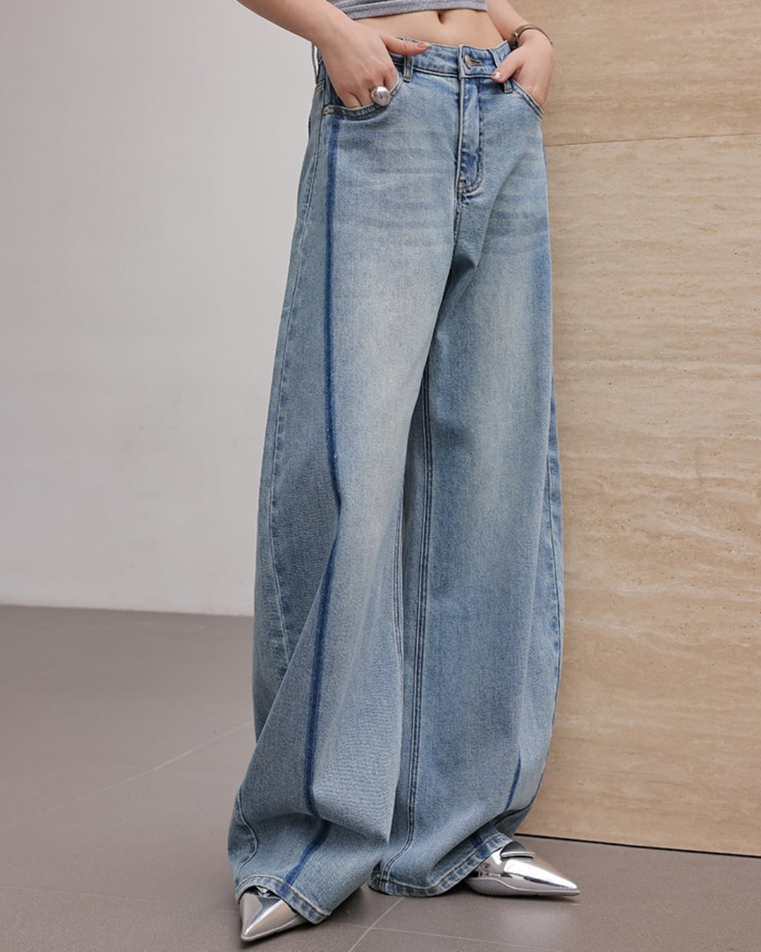 ヴィンテージライクなカラーブロッキングが目を引くワイドレッグデニム。