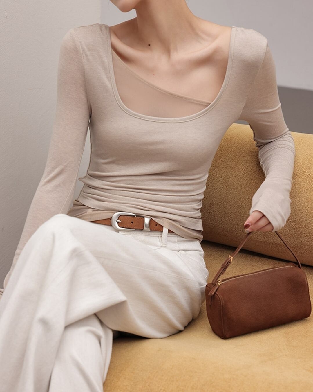 程よいフィット感で、女性らしいシルエットを演出する長袖トップス。