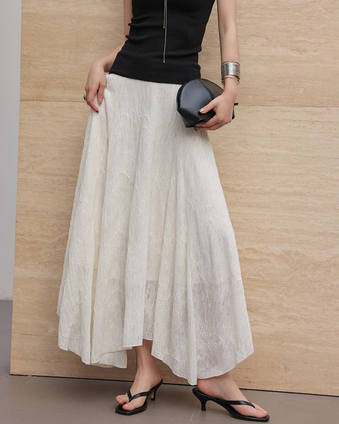 アシンメトリーな裾が特徴的なニュアンス入り生地で仕立てたロングフレアスカート。