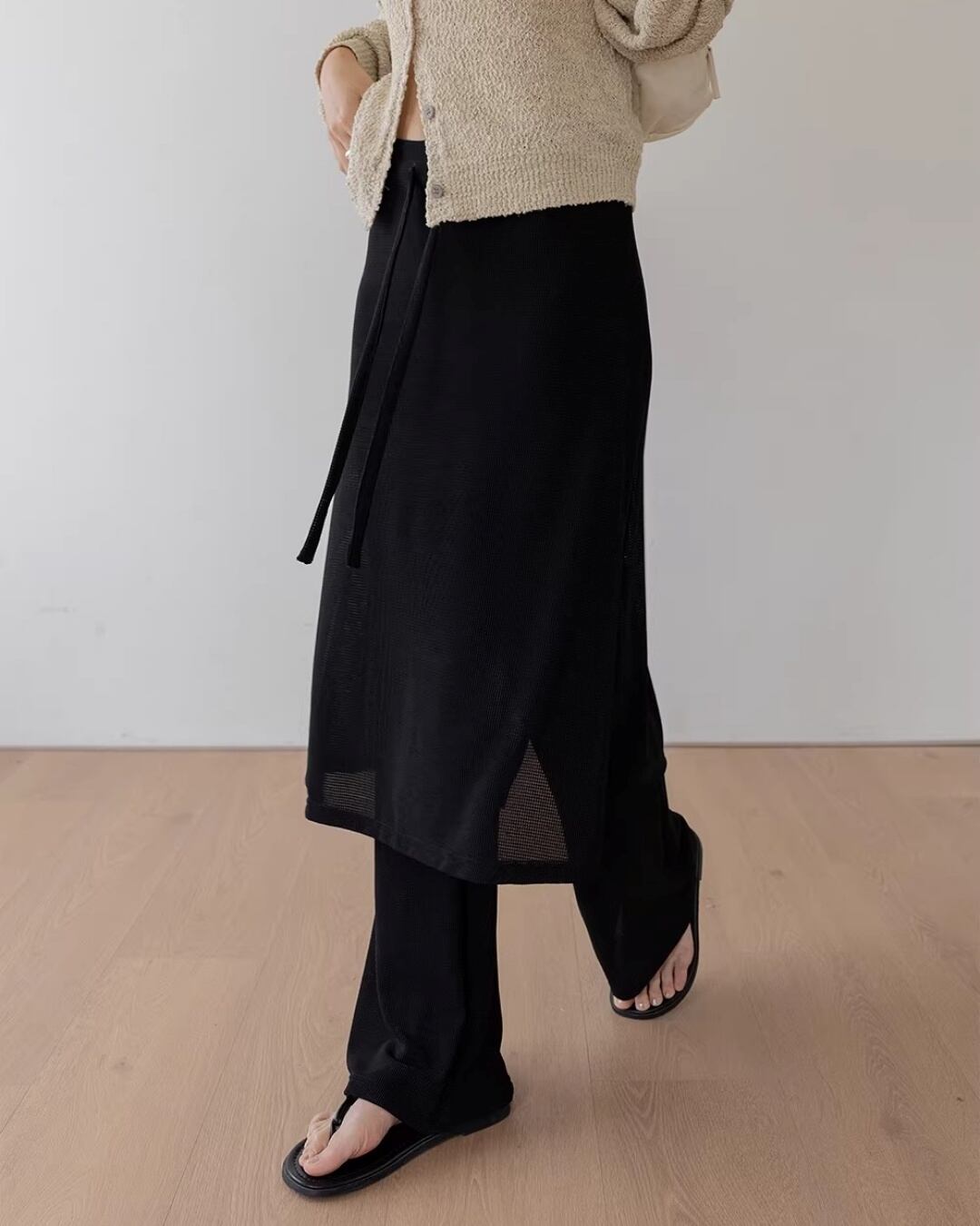 シアーな素材感が抜け感を生み出す、ラップデザインのパンツ。
