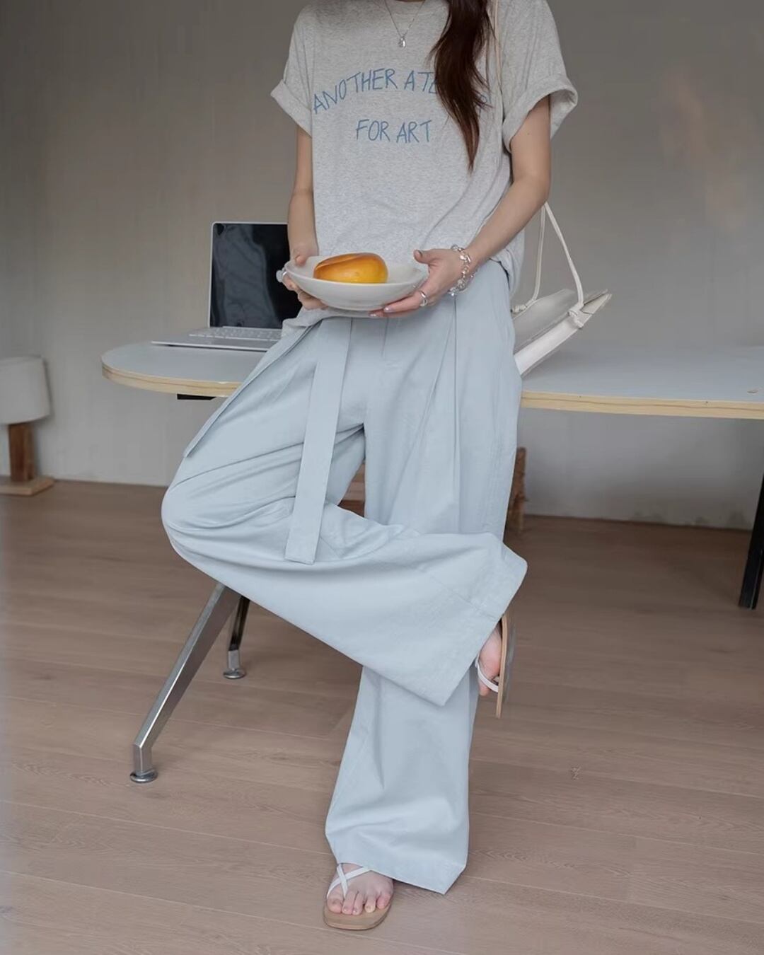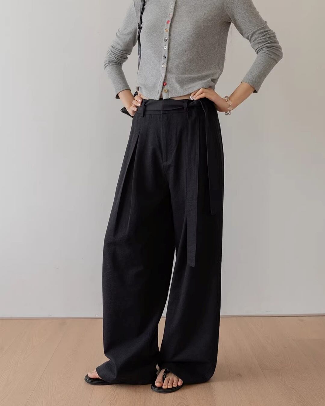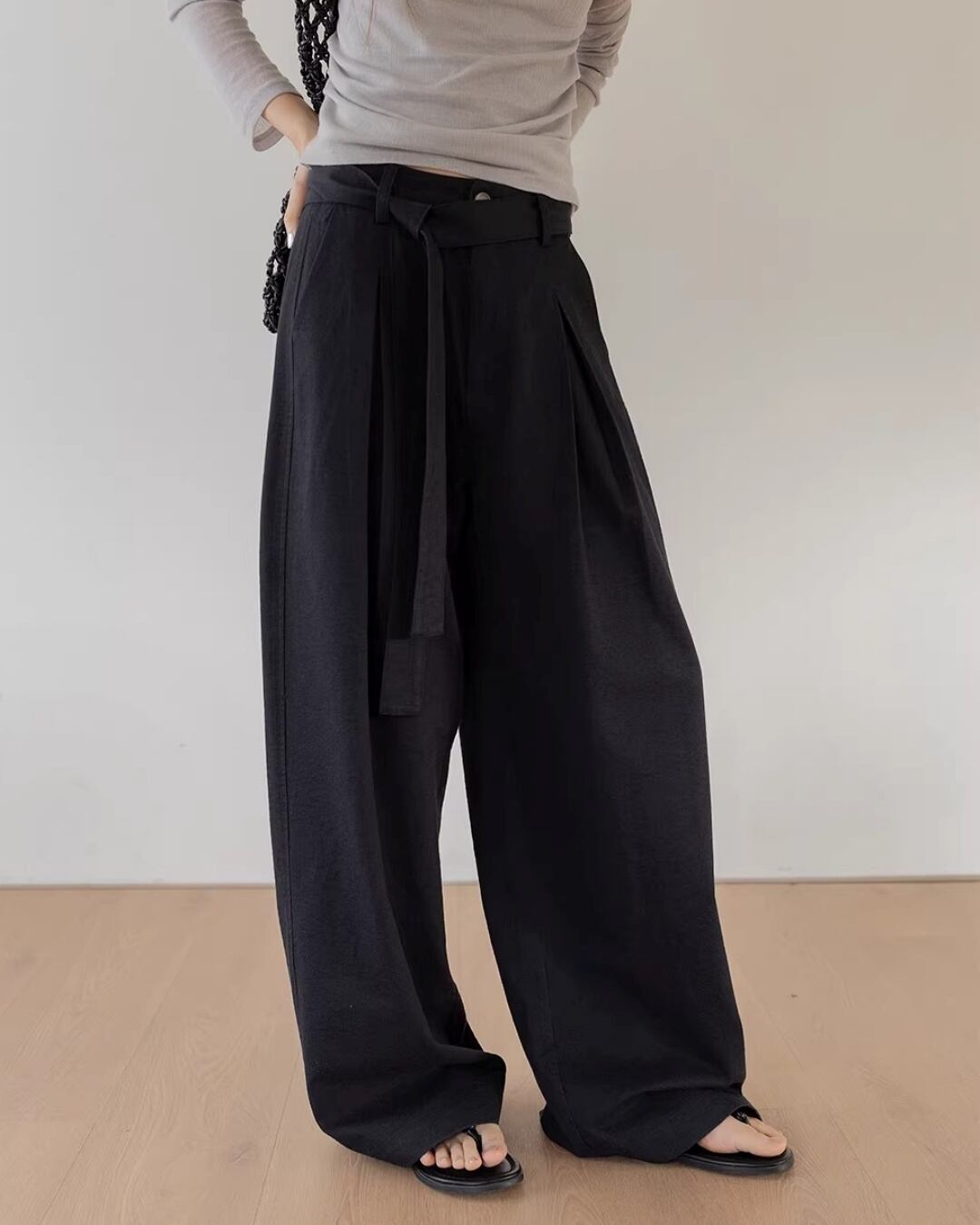 ベルト付きでアレンジを楽しめるワイドレッグパンツ。