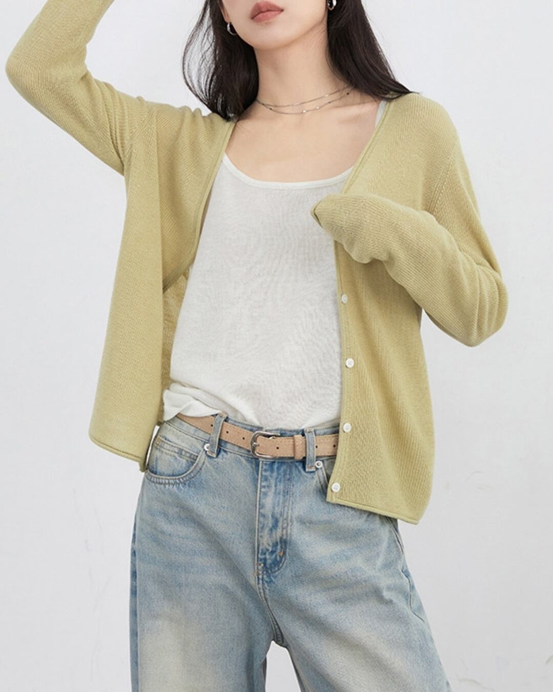 フロントボタンがアクセントの長袖クロップドニットカーディガン。