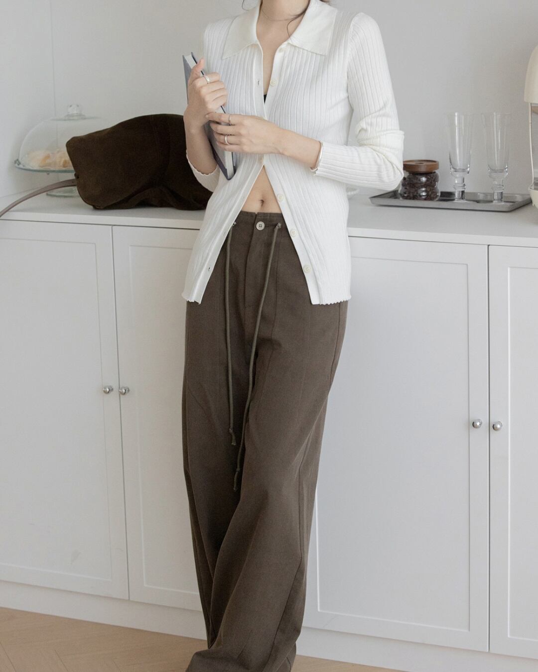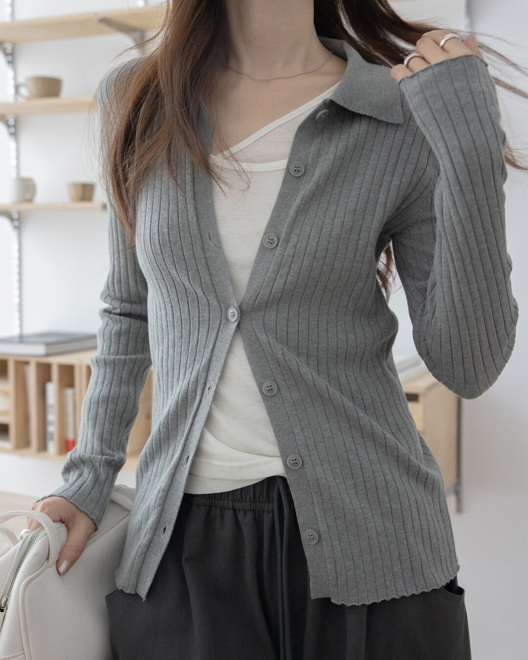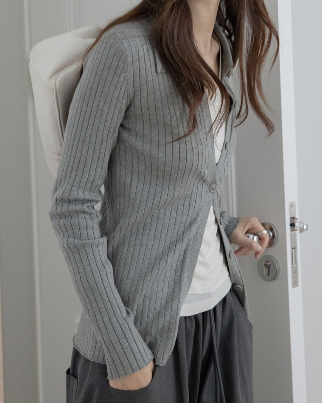 体のラインを美しく引き立てるスリムシルエットが特徴のカーディガンです。
