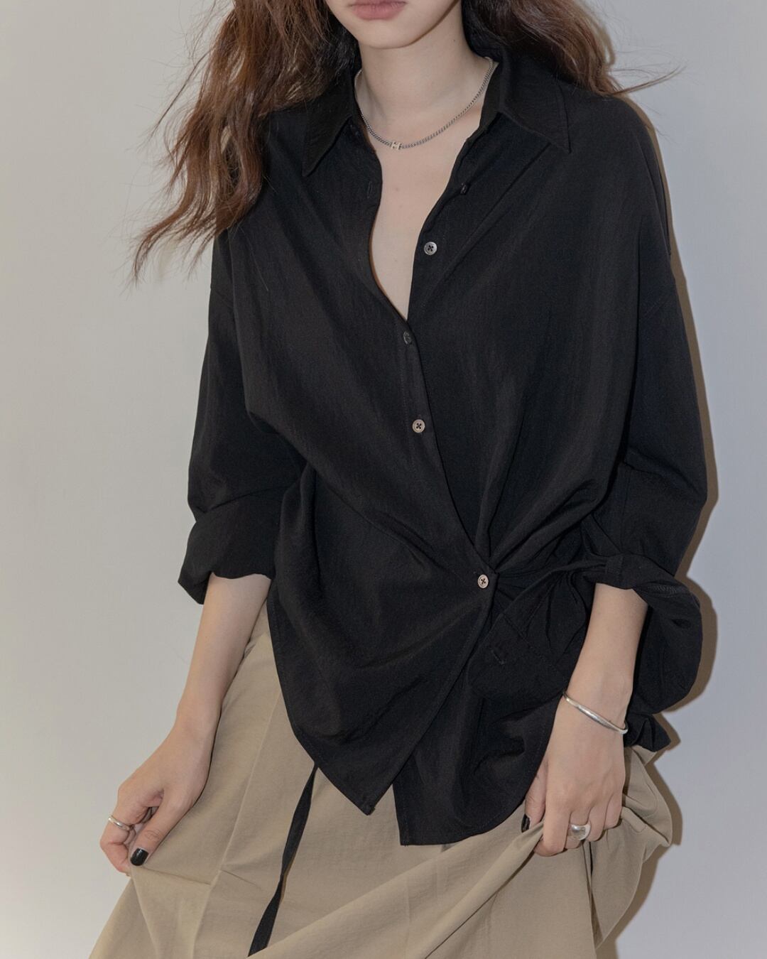 シンプルなドレープデザインが特徴のロングスリーブシャツです。