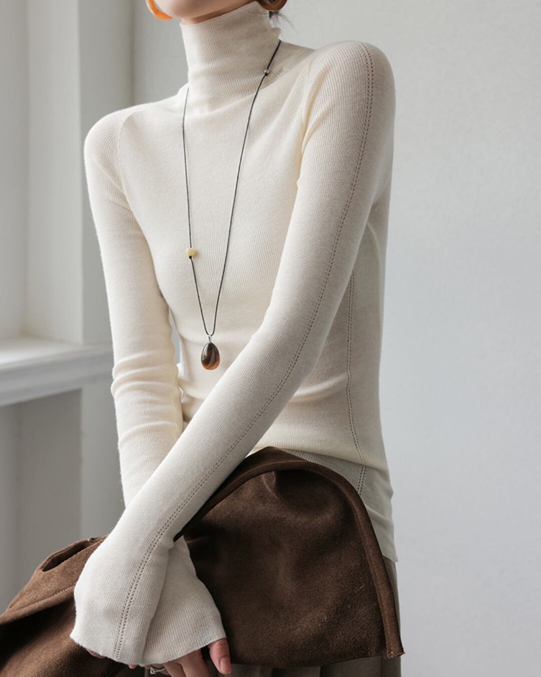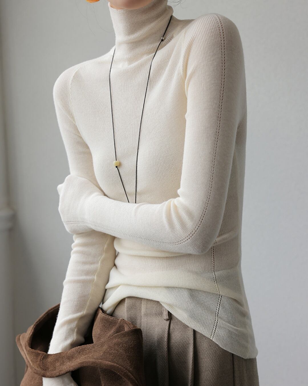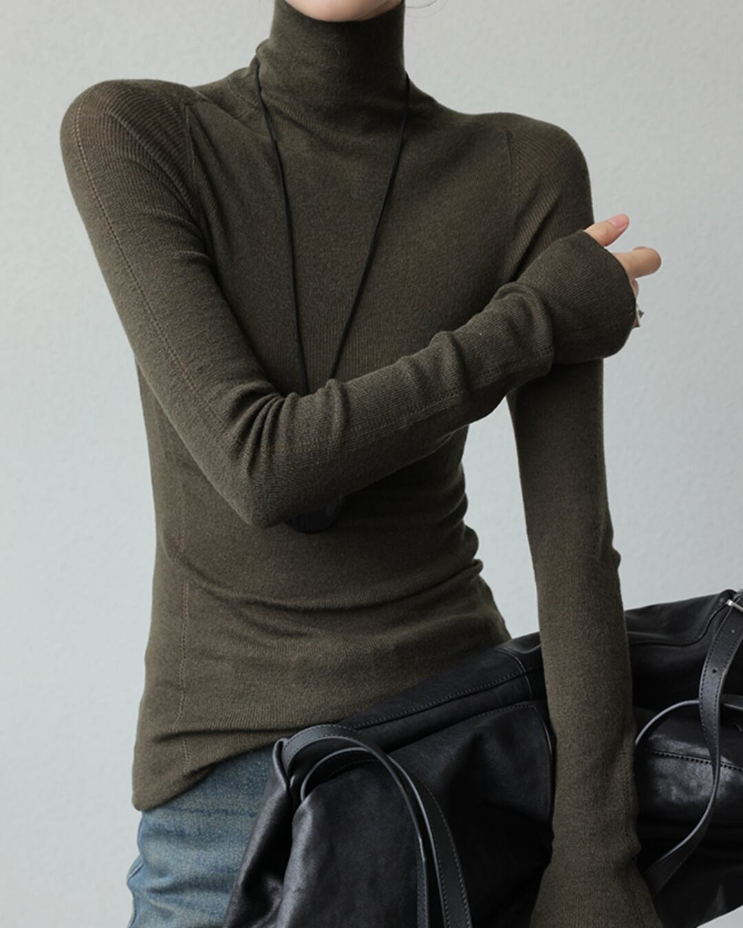 シンプルでスタイリッシュなハイネックニットロングスリーブトップ。