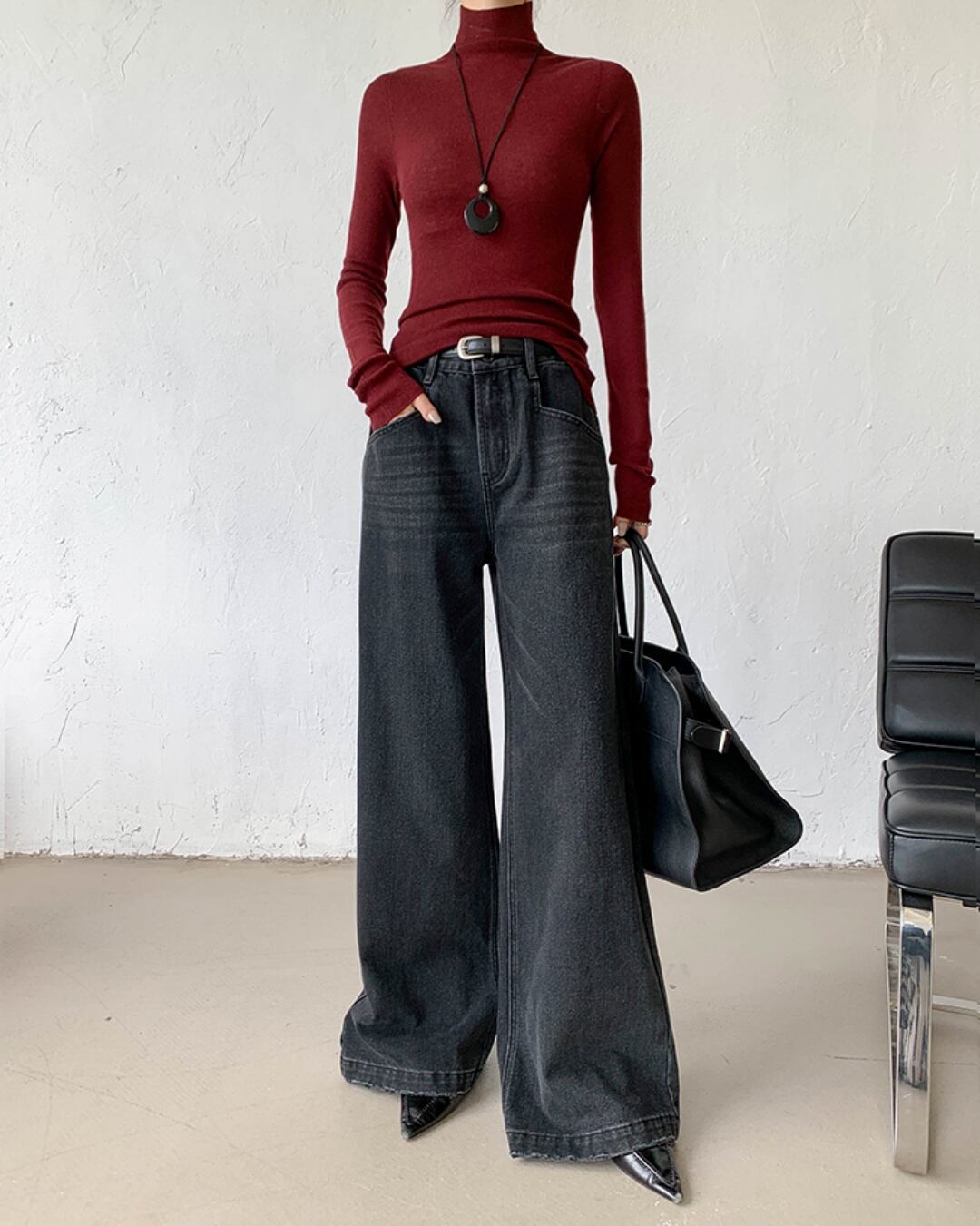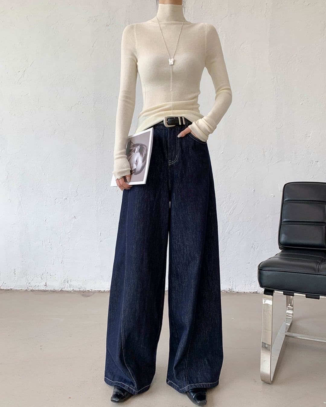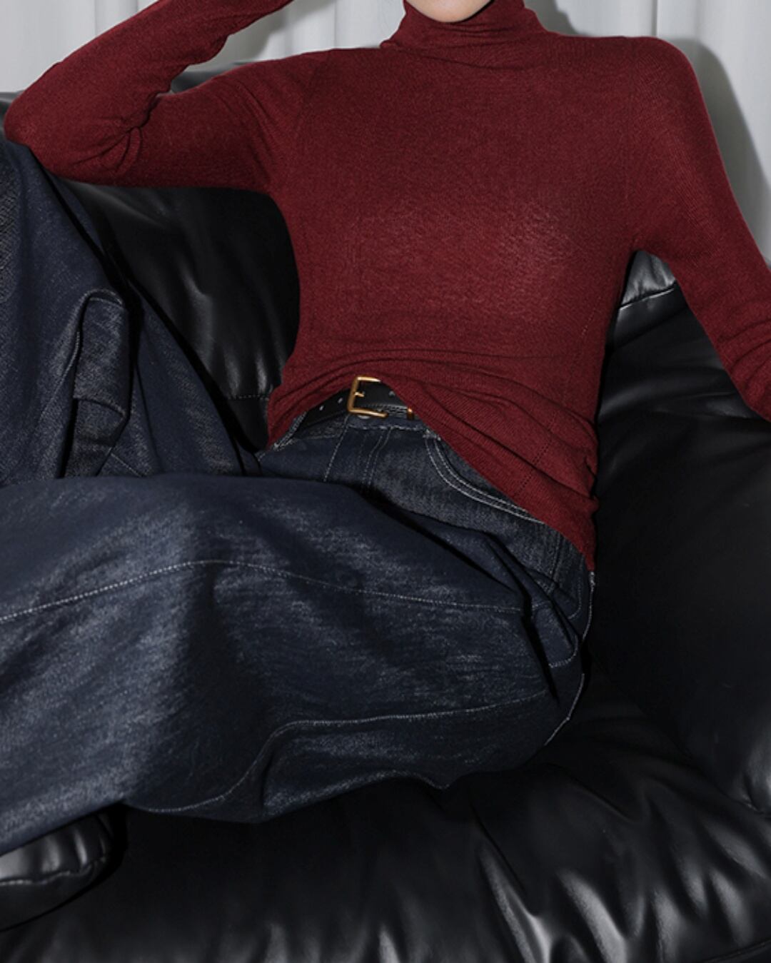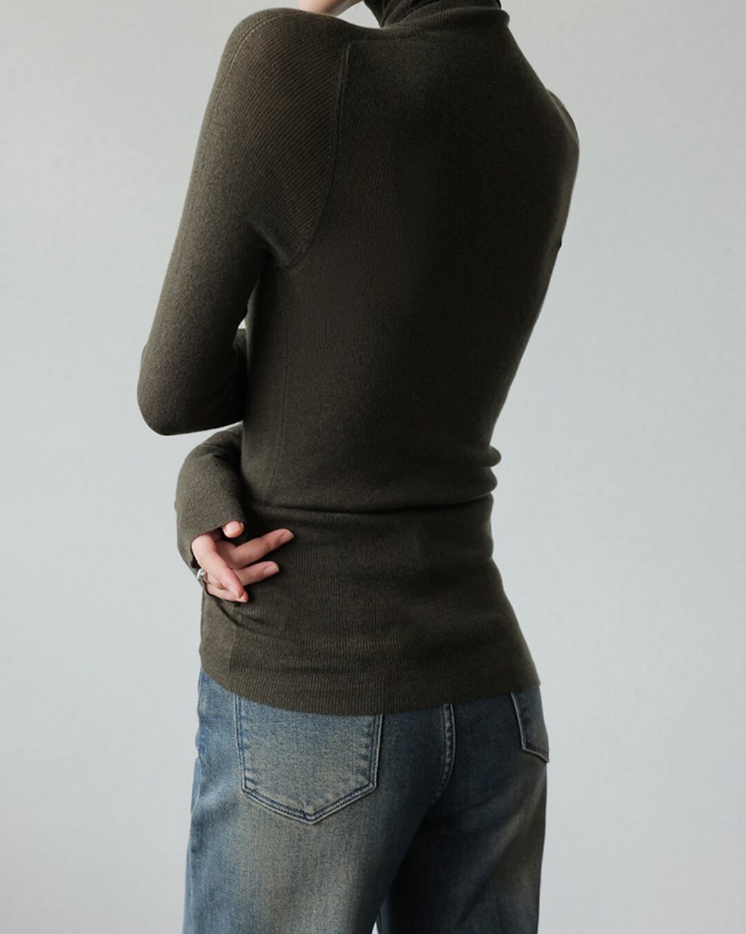 シンプルでスタイリッシュなハイネックニットロングスリーブトップ。