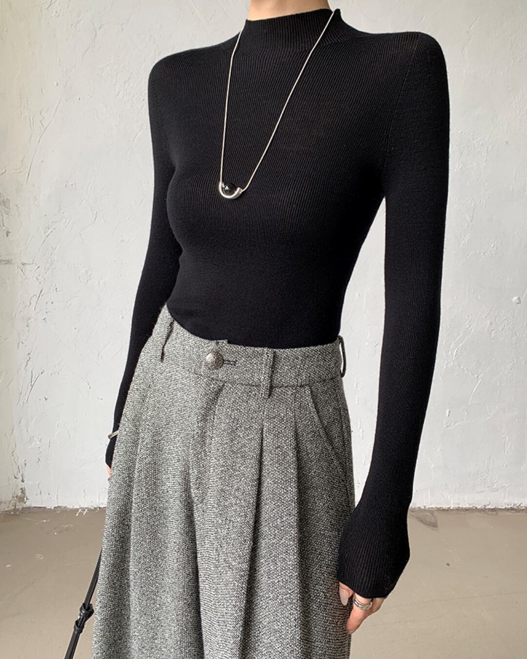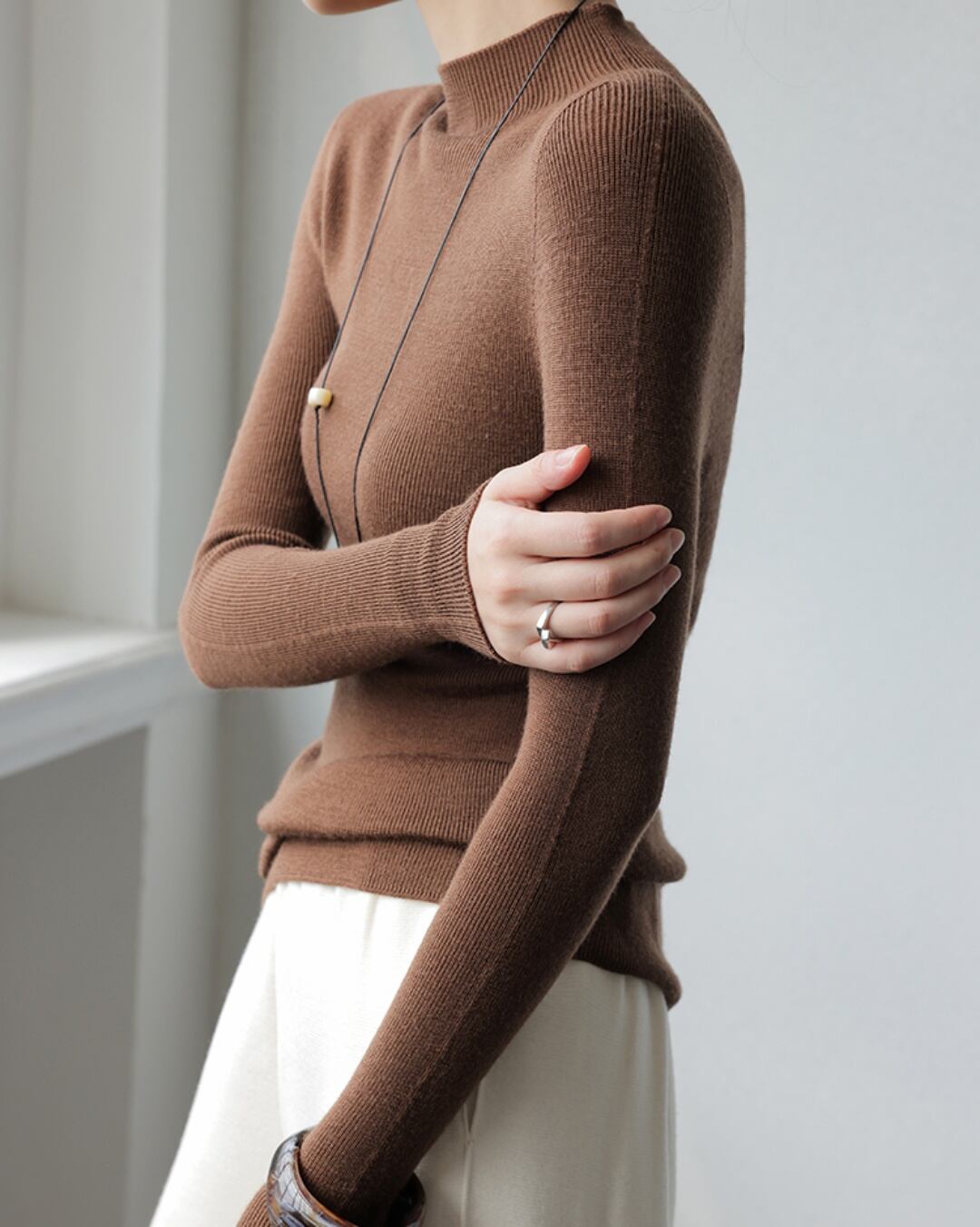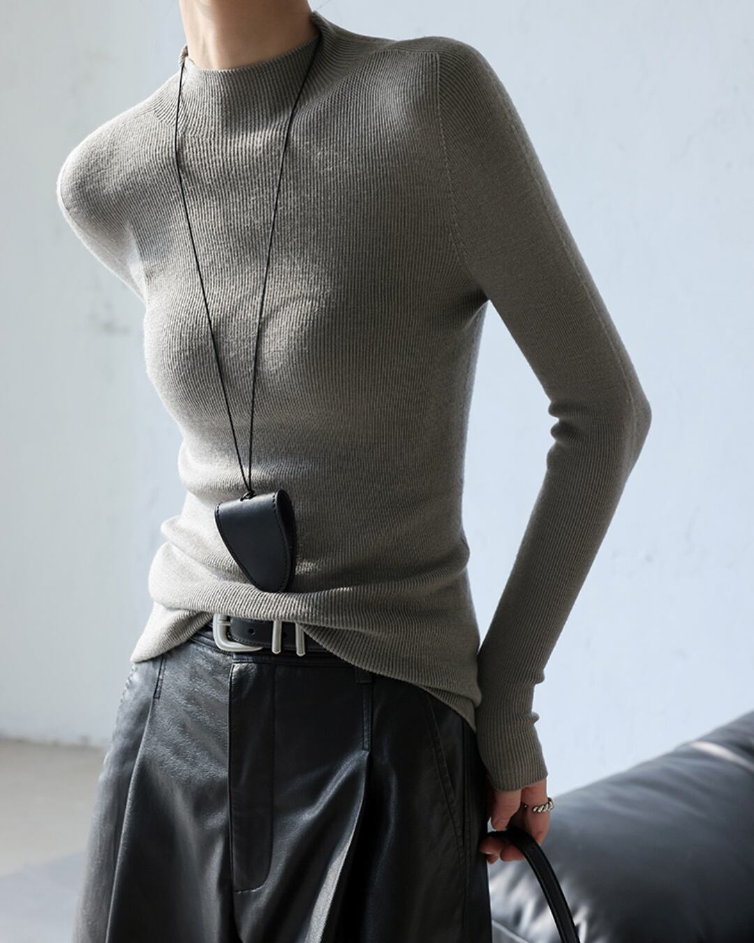 ハーフタートルネックのデザインは、首元をさりげなく温め、上品な印象を与えます。