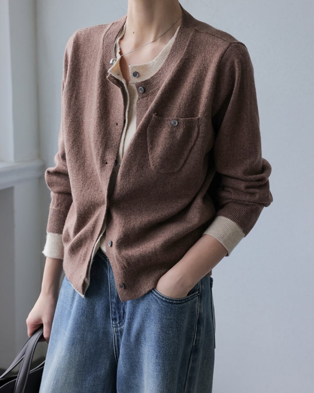 エフォートレスなスタイルを実現するレイヤードシンプルニットカーディガン。