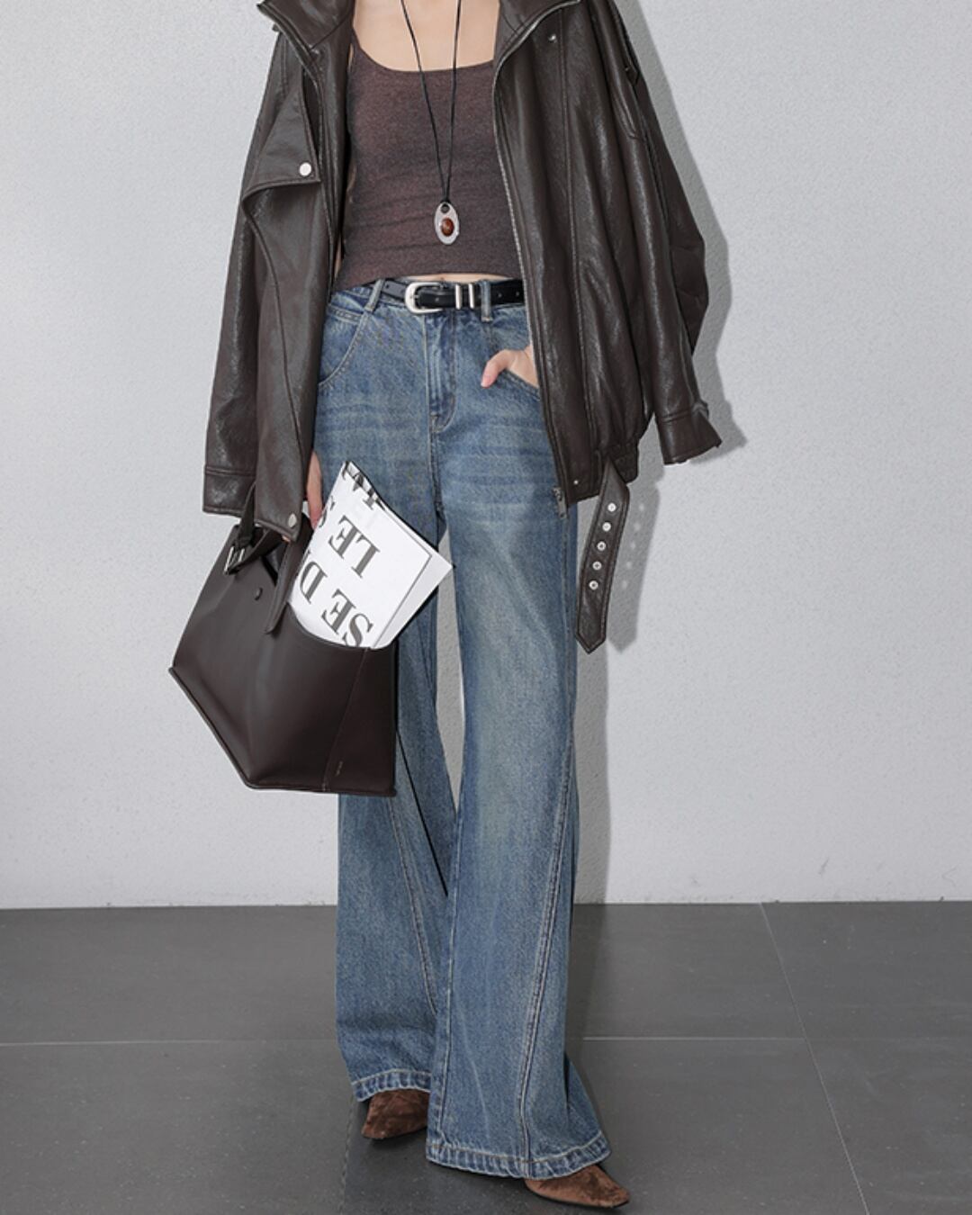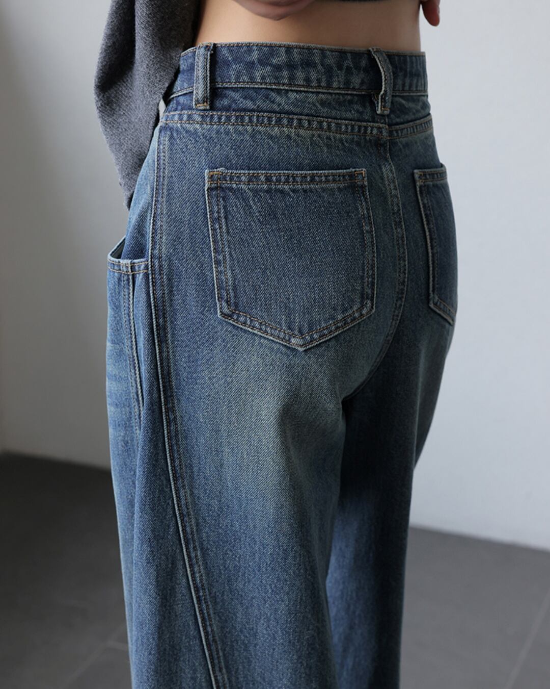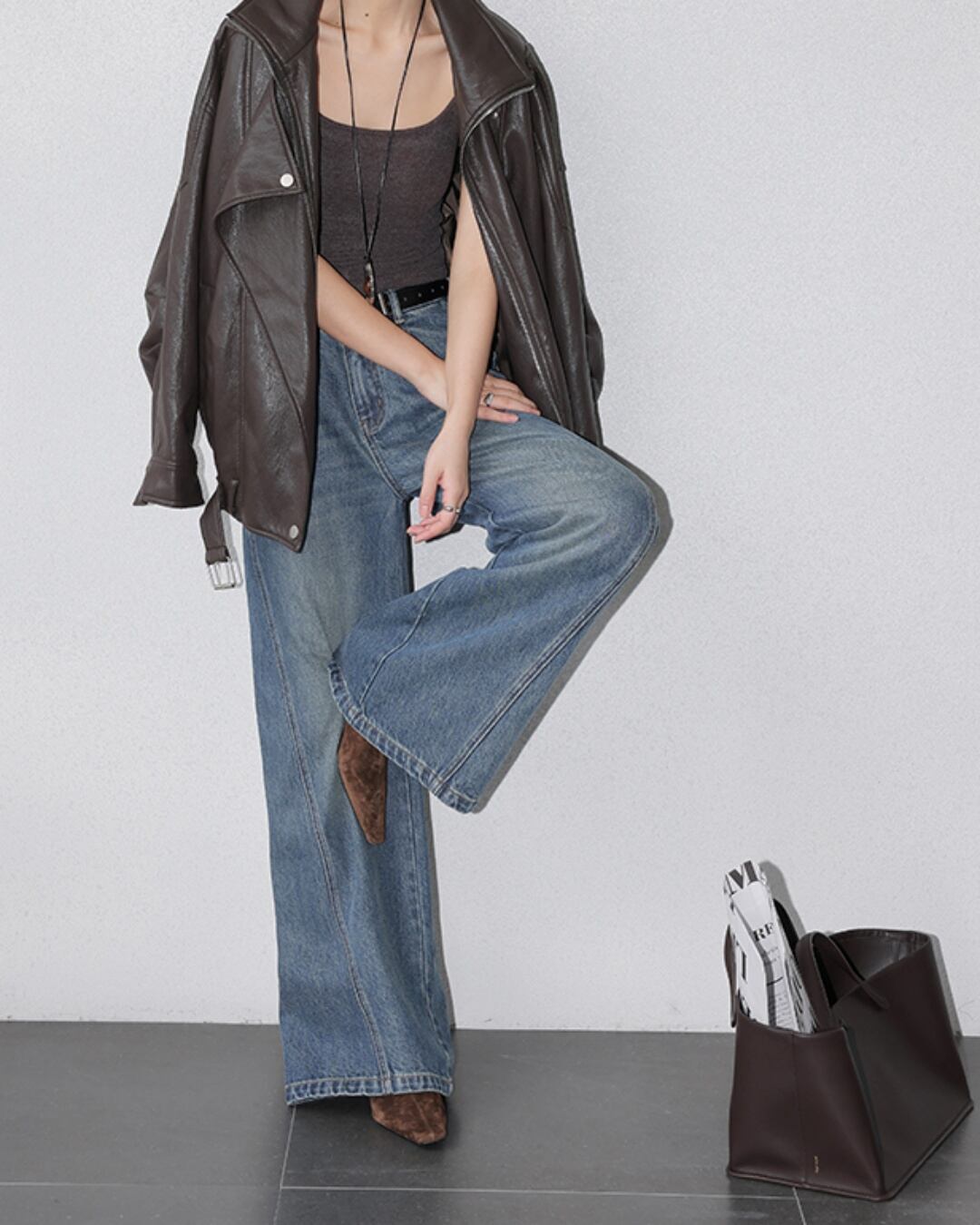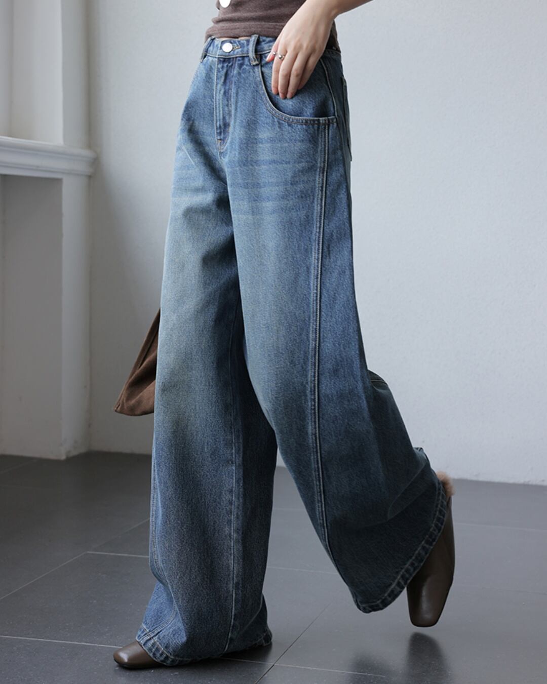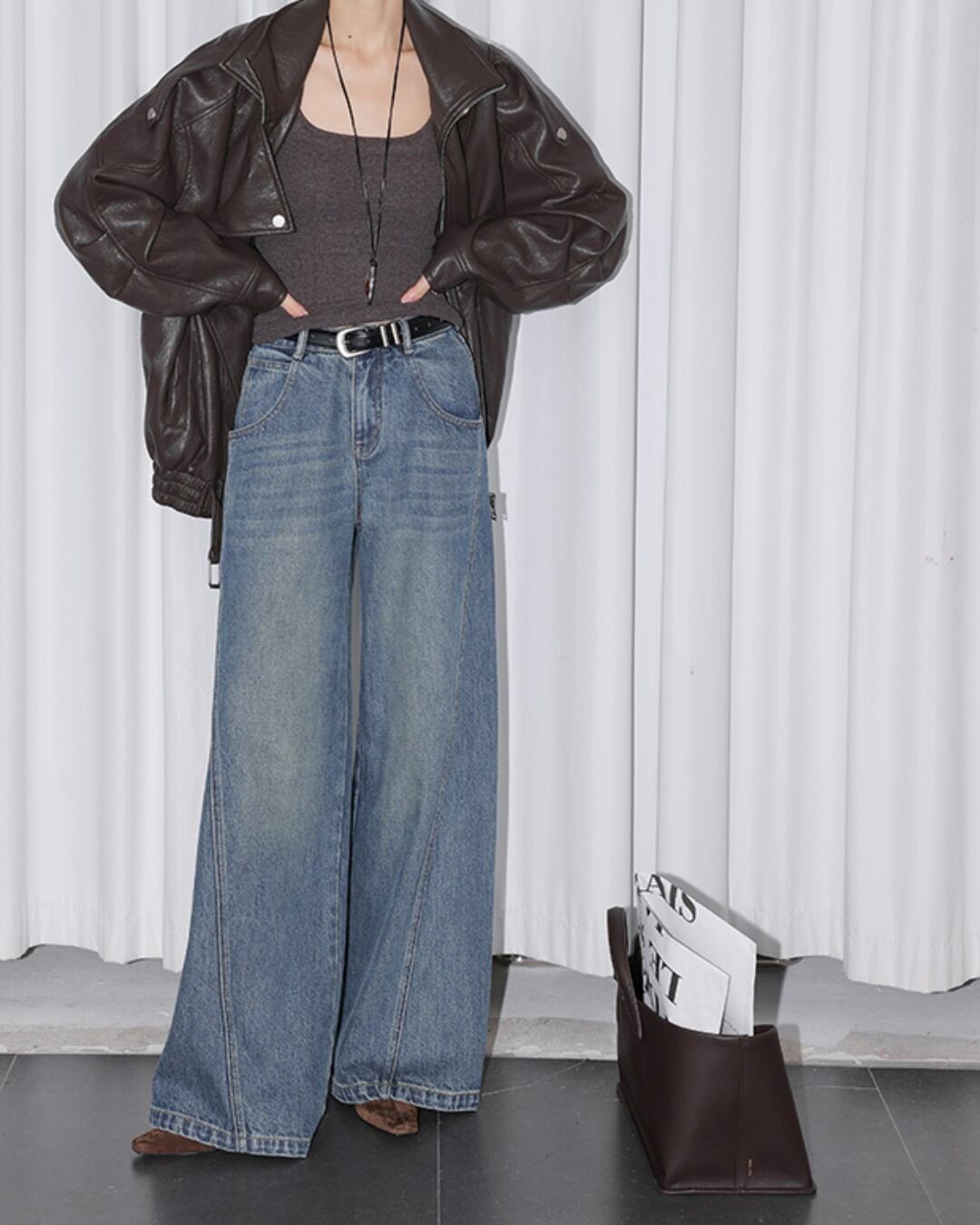 トレンド感あふれるハイウェストワイドレッグジーンズ。