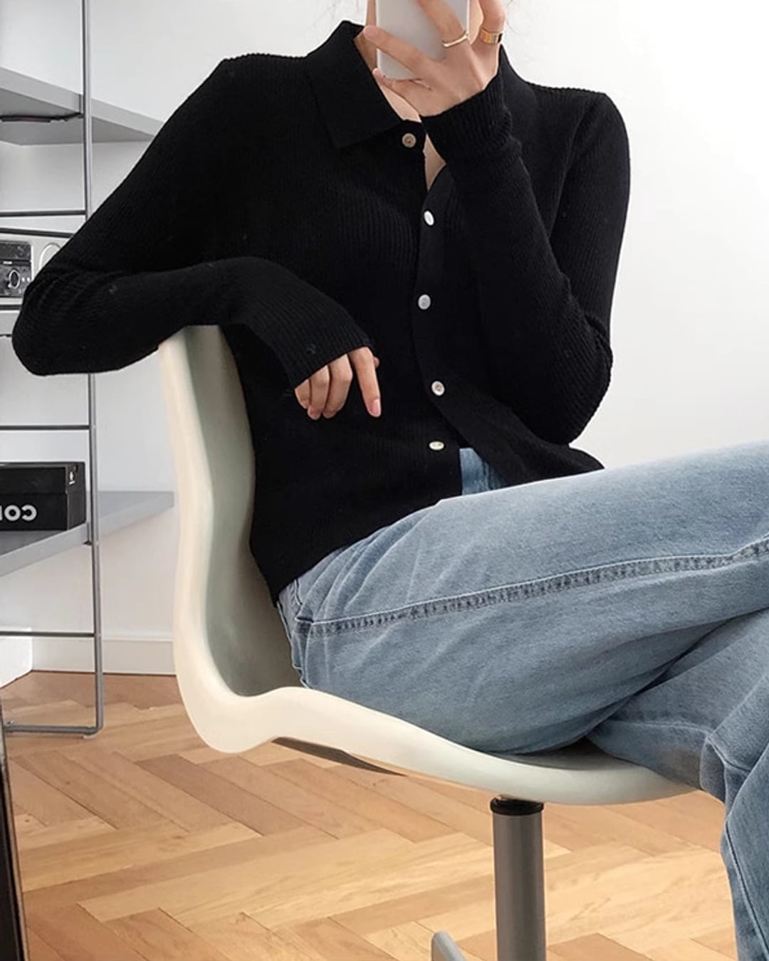 薄手で着まわしの効くポロ襟カーディガン。