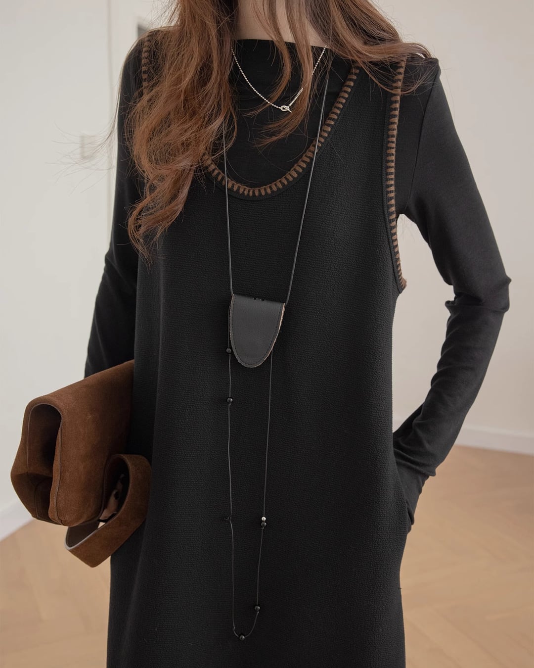 ステッチの縁取りがアクセントになったジャンパースカート。