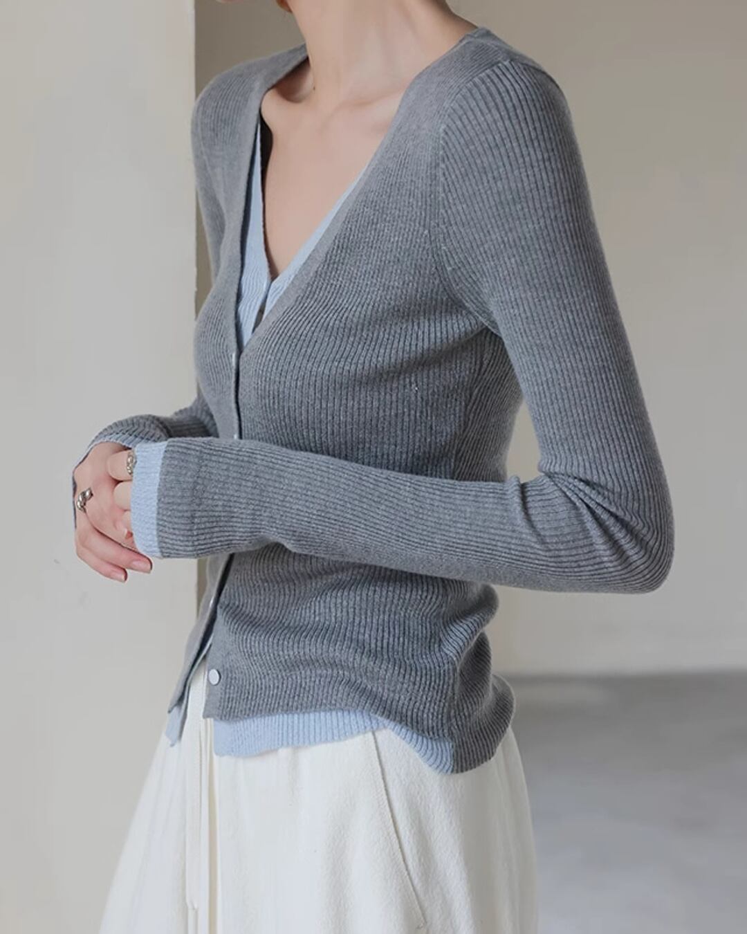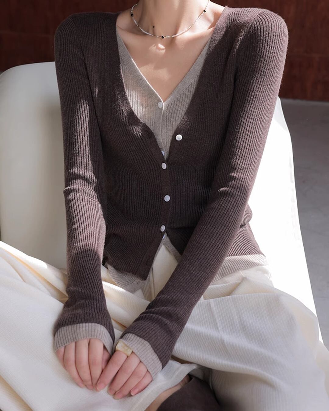 カジュアルにもきれいめにも合わせられる重ね着風カーディガン。