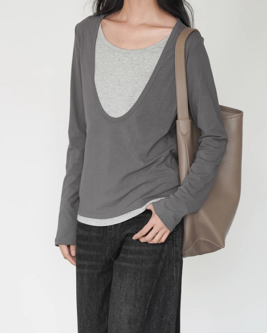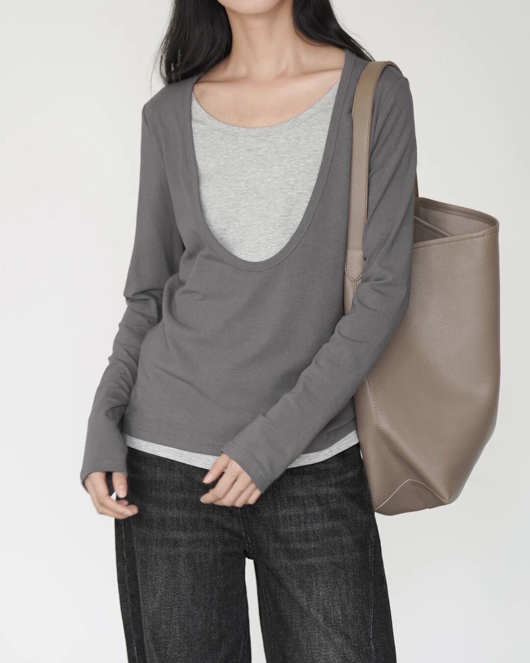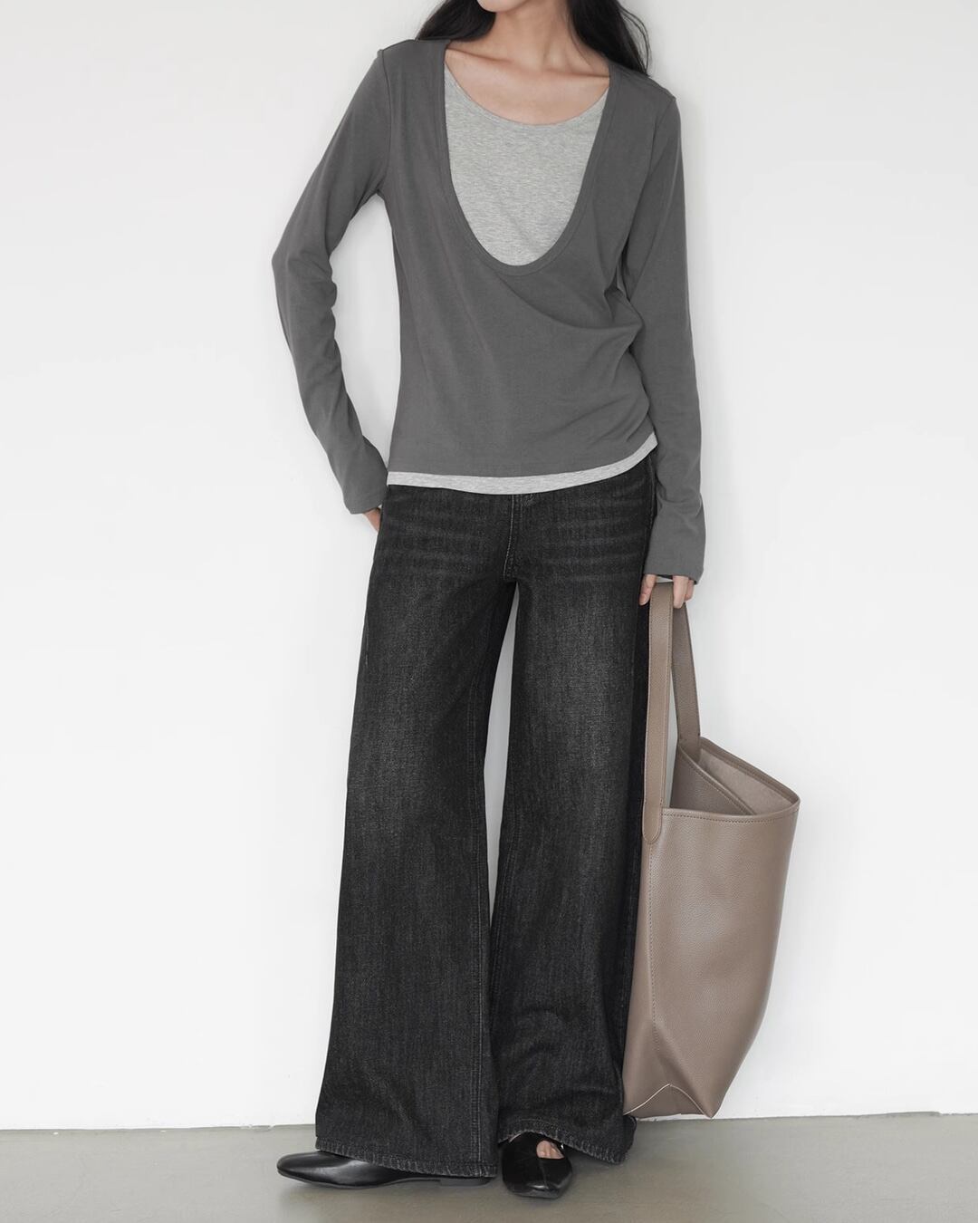 広めに開いたネックラインは小顔効果が期待でき、アクセサリーもよく映えます。