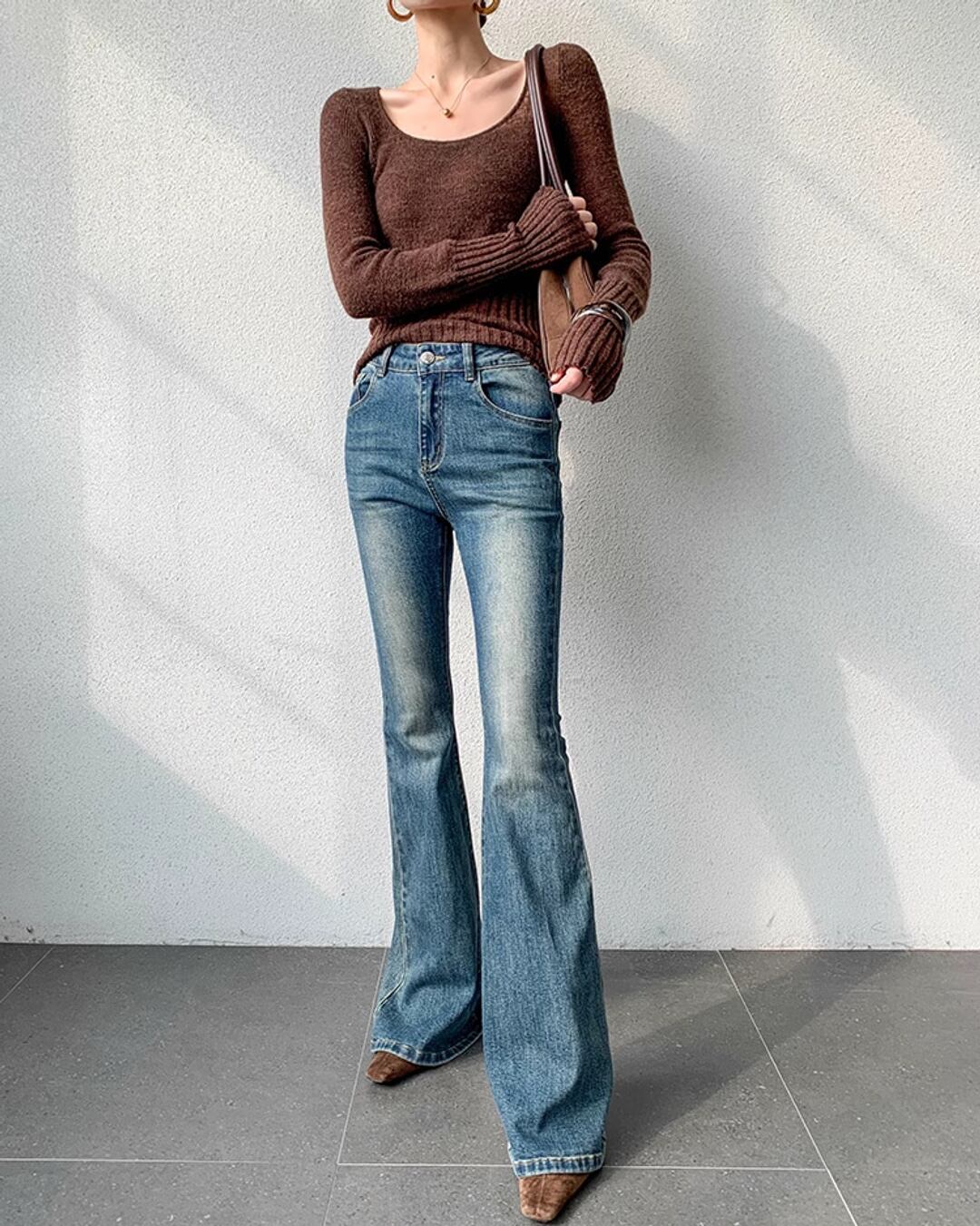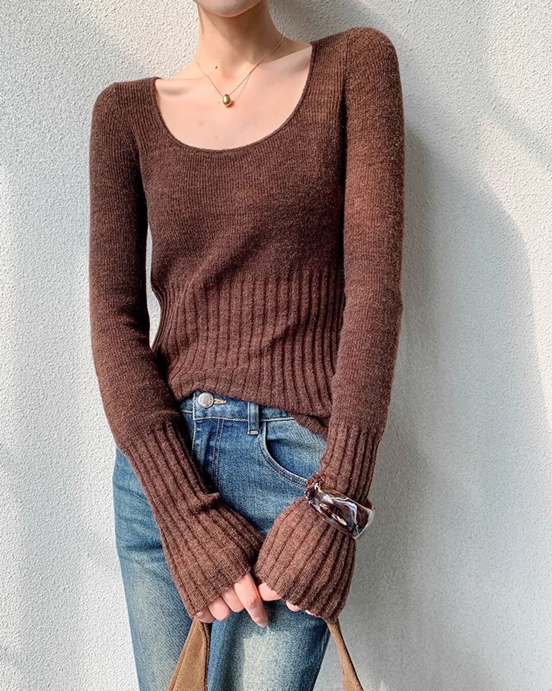 大きく開いたネックラインや、フィット感のあるシルエットが女性らしさを引き立てます。