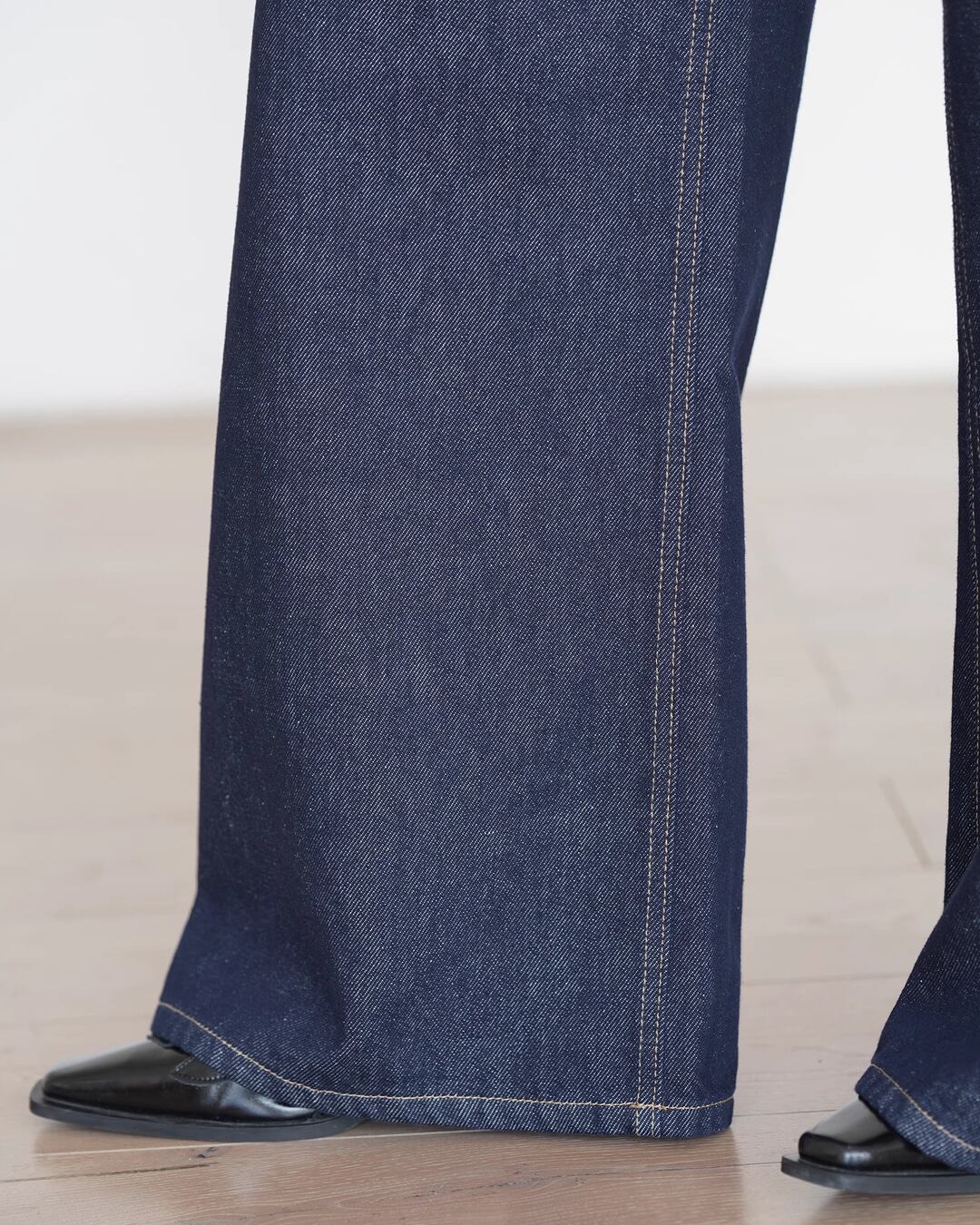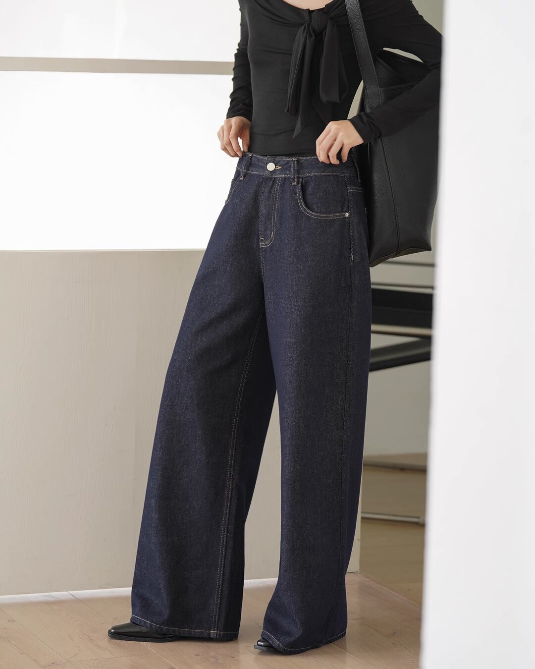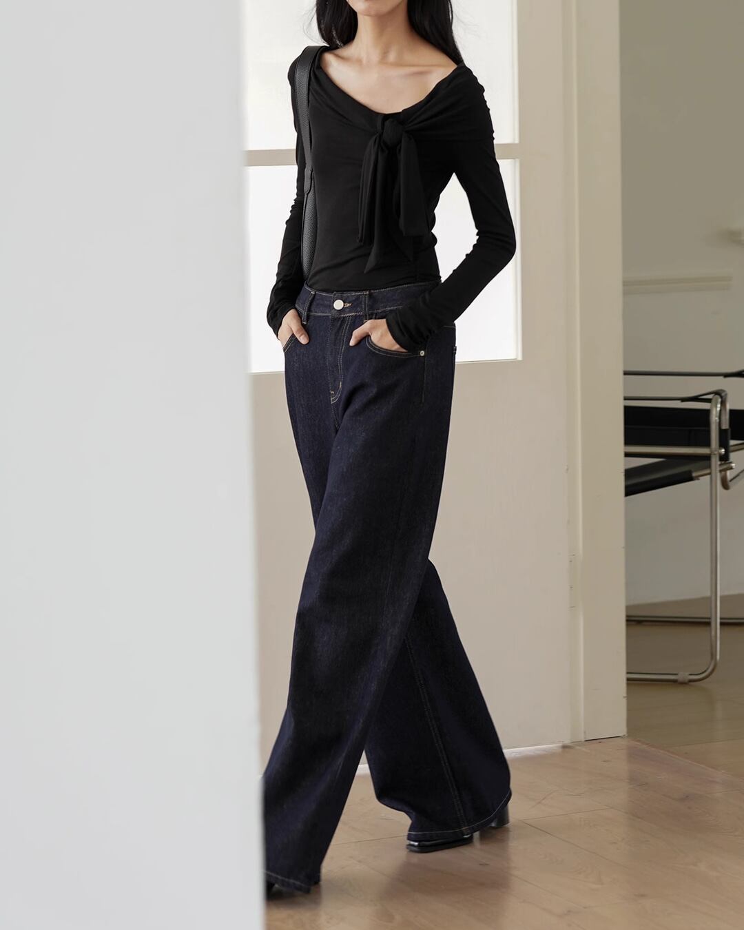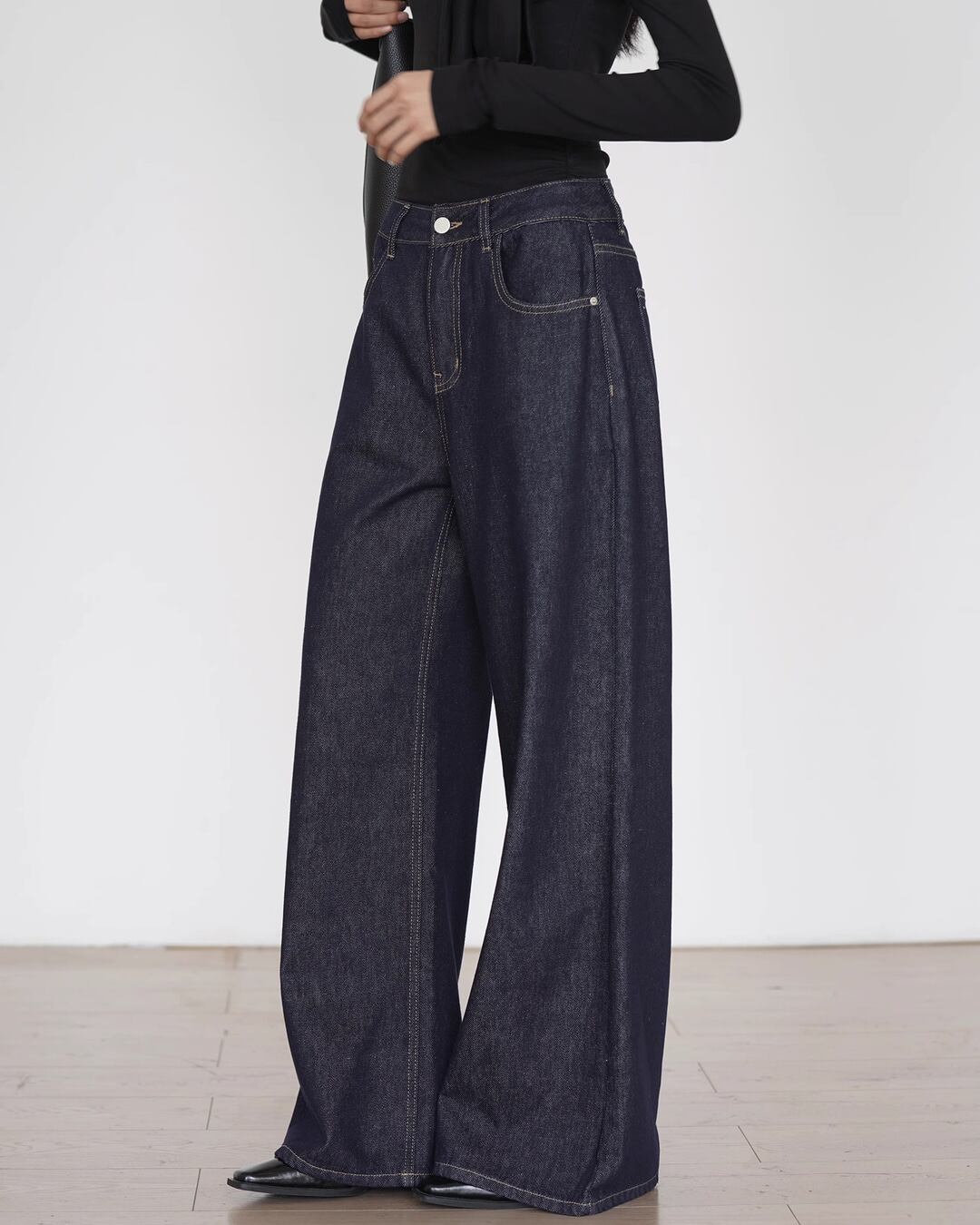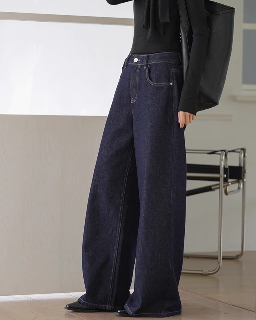 オールシーズン着回し可能なワイドデニムパンツ。